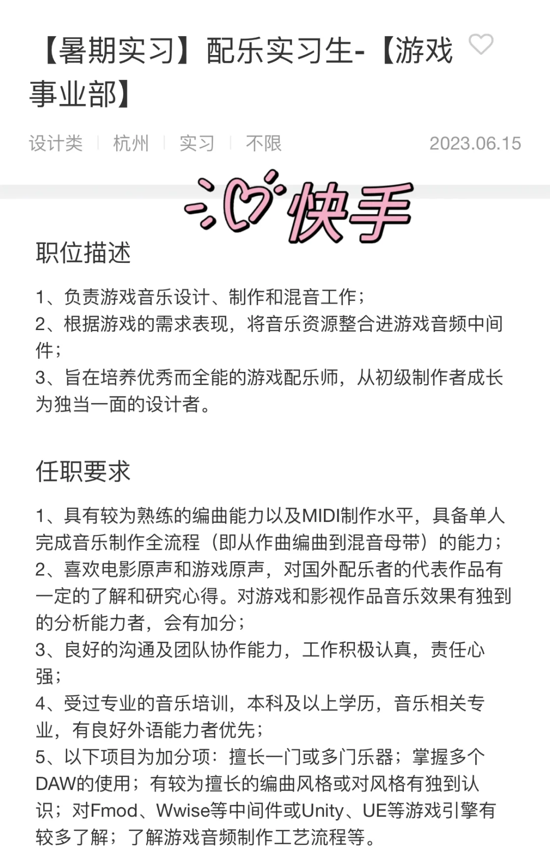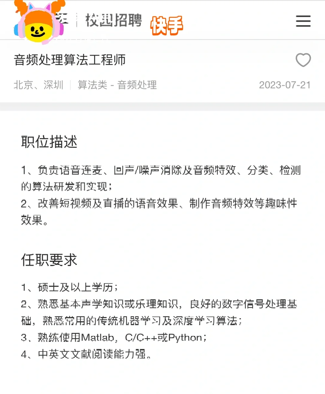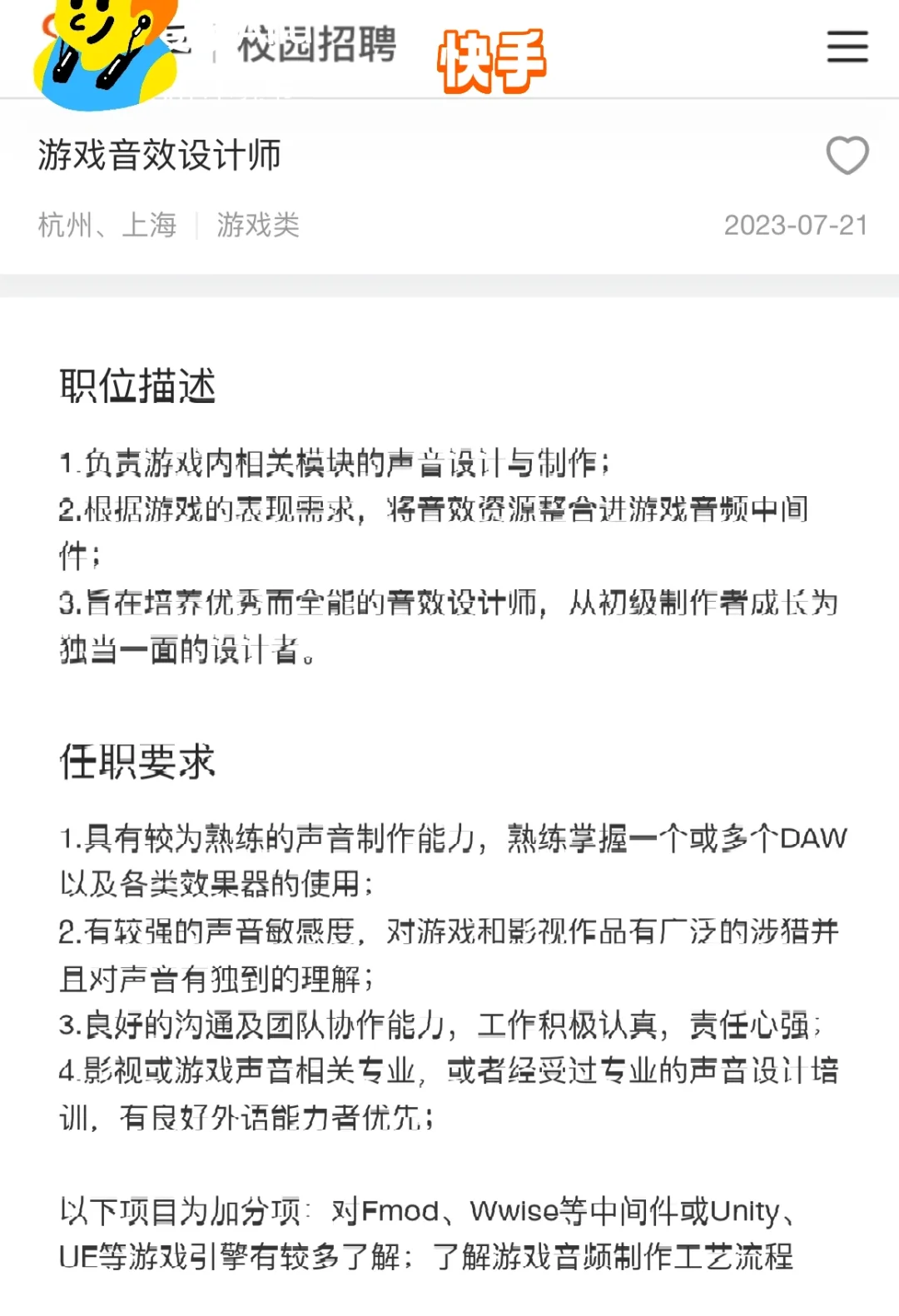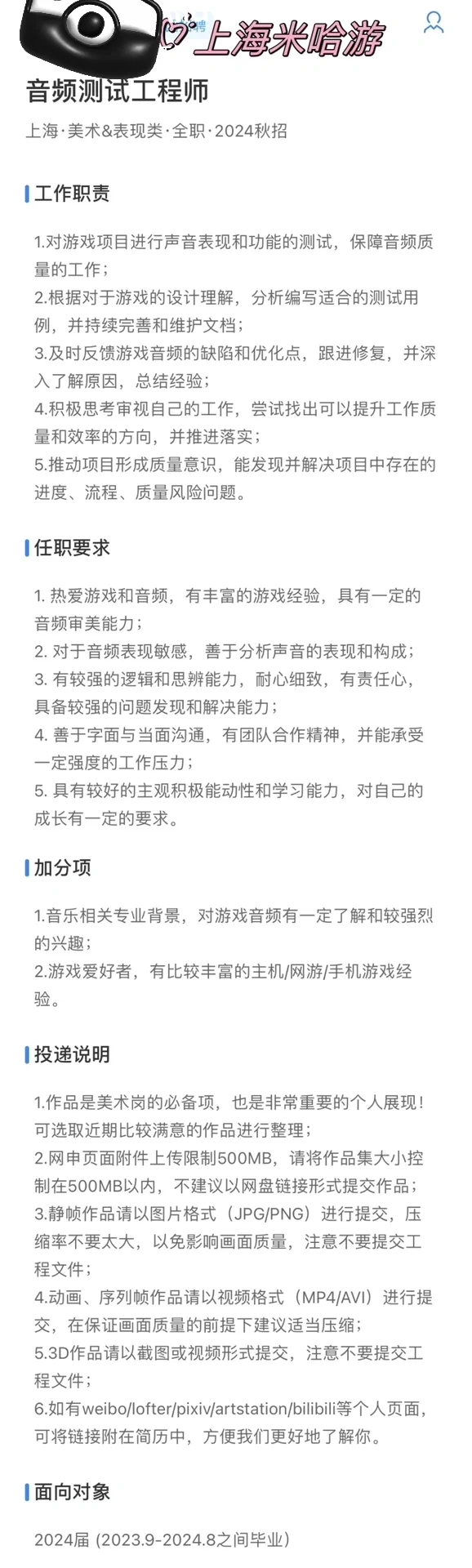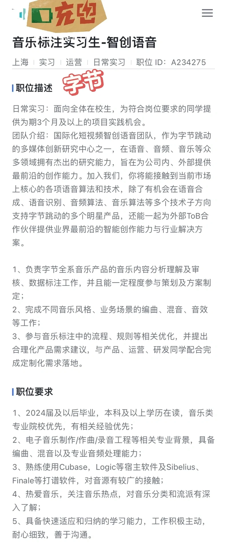 大家可以参考一下,未来的工作方向与要求,音乐与科技、创造的综合交叉专业,大厂要求比较高,本科+名校,其实大厂要本科已经要求很低了,也就我们专业能这样要求了。有需要的同学可以去试试看。平台不允许露出logo,只能这样看了