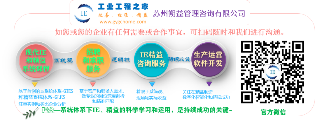 关注我们,享受系统、专业、体系化、重实用的IE精益知识讲解和岗位推荐剖析服务。关于IE、精益系统课程学习、企业IE精益培训、辅导以及其它咨询或合作,可随时联系我们~