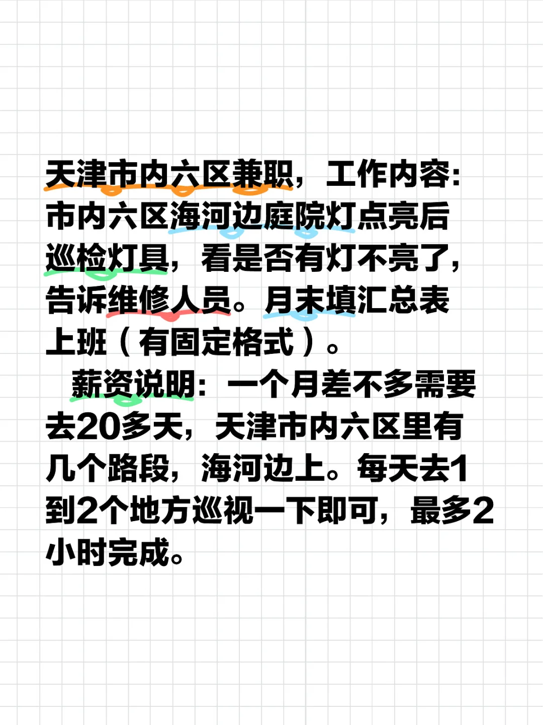 工作内容:市内六区海河边庭院灯点亮后巡检灯具,看是否有灯不亮了,告诉维修人员。月末填汇总表上班(有固定格式)。 薪资说明:一个月差不多需要去20多天,天津市内六区里有几个路段,海河边上。每天去1到2个地方巡视一下即可,最多2小时完成。每去一天100元。