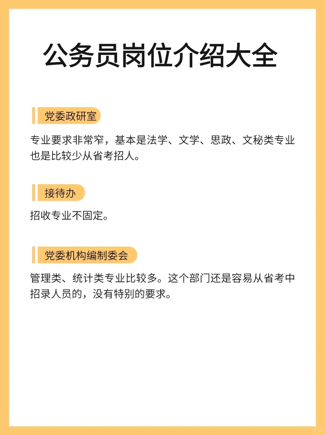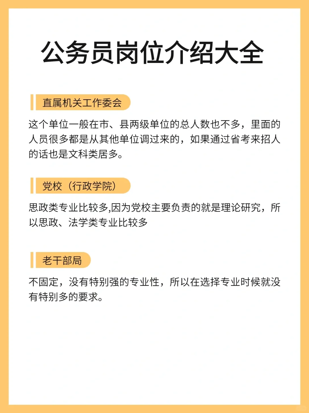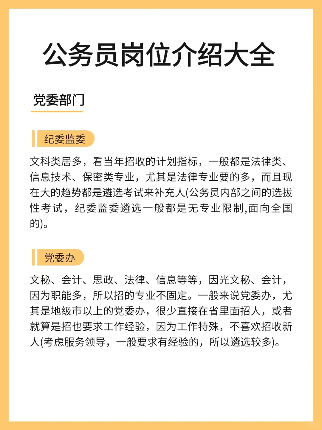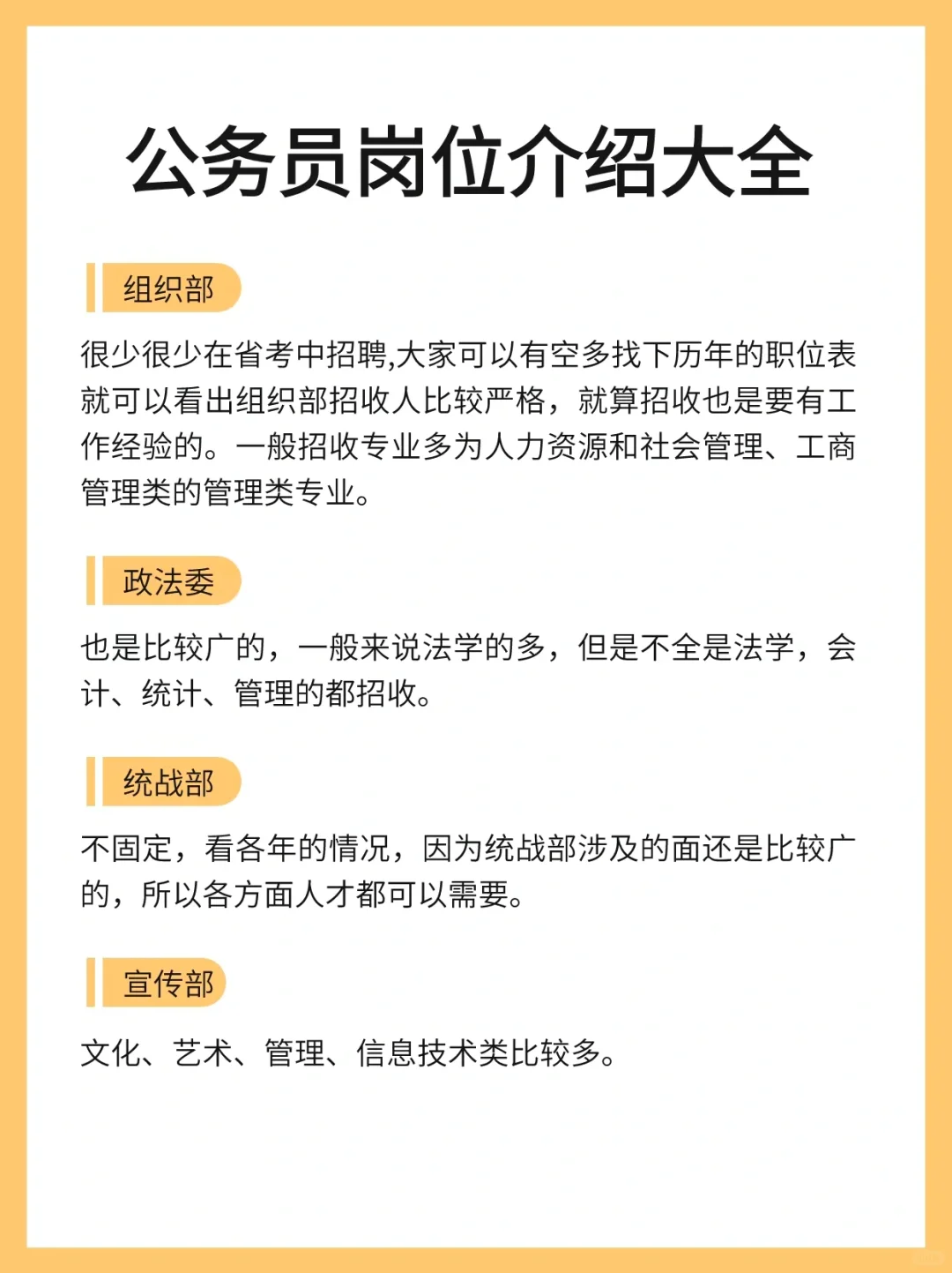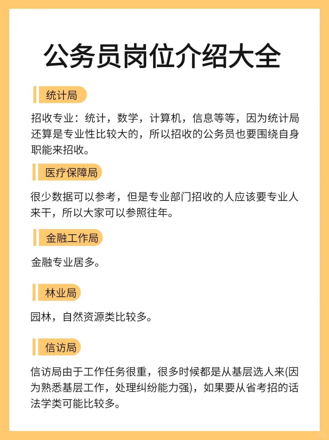 公务员岗位介绍大全(第三期)赶快码住‼️ 📝统计局 招收专业:统计,数学,计算机,信息等等,因为统计局还算是专业性比较大的,所以招收的公务员也要围绕自身职能来招收。 📝医疗保障局 很少数据可以参考,但是专业部门招收的人应该要专业人来干,所以大家可以参照往年。 📝金融工作局 金融专业居多。 📝林业局 园林,自然资源类比较多。 📝信访局 信访局由于工作任务很重,很多时候都是从基层选人来(因为熟悉基层工作,处理纠纷能力强),如果要从省考招的话法学类可能比较 📝纪委监委 文科类居多,看当年招收的计划指标,一般都是法律类、信息技术、保密类专业,尤其是法律专业要的多,而且现在大的趋势都是遴选考试来补充人(公务员内部之间的选拔性考试,纪委监委遴选一般都是无专业限制,面向全国的)。 📝党委办 文秘、会计、思政、法律、信息等等,因光文秘、会计,因为职能多,所以招的专业不固定。一般来说党委办,尤其是地级市以上的党委办,很少直接在省里面招人,或者就算是招也要求工作经验,因为工作特殊,不喜欢招收新人(考虑服务领导,一般要求有经验的,所以遴选较多)。 📝组织部 很少很少在省考中招聘,大家可以有空多找下历年的职位表就可以看出组织部招收人比较严格,就算招收也是要有工作经验的。一般招收专业多为人力资源和社会管理、工商管理类的管理类专业。 📝政法委 也是比较广的,一般来说法学的多,但是不全是法学,会计、统计、管理的都招收。 📝统战部 不固定,看各年的情况,因为统战部涉及的面还是比较广的,所以各方面人才都可以需要。 📝宣传部 文化、艺术、管理、信息技术类比较多。党委政研室 专业要求非常窄,基本是法学、文学、思政、文秘类专业也是比较少从省考招人。 📝接待办 招收专业不固定。 📝党委机构编制委会 管理类、统计类专业比较多。这个部门还是容易从省考中招录人员的,没有特别的要求。 📝直属机关工作委会 这个单位一般在市、县两级单位的总人数也不多,里面的人员很多都是从其他单位调过来的,如果通过省考来招人的话也是文科类居多。 📝党校(行政学院) 思政类专业比较多,因为党校主要负责的就是理论研究,所以思政、法学类专业比较多 📝老干部局 不固定,没有特别强的专业性,所以在选择专业时候就没有特别多的要求。 |