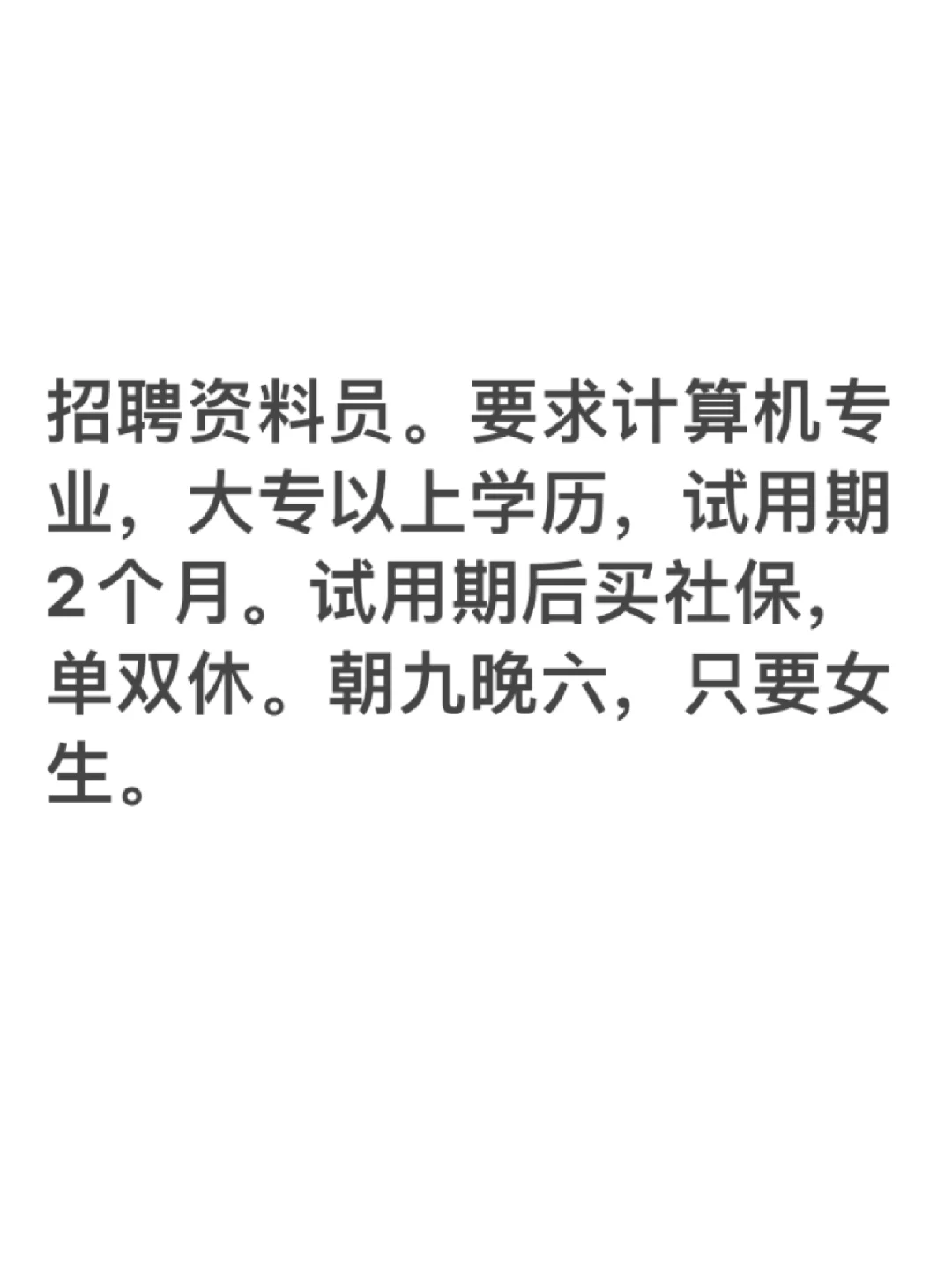 招聘资料员。要求计算机专业,大专以上学历,试用期2个月。试用期后买社保,单双休。朝九晚六,只要女生。没有办公室文化!大家都很好相处,上班不用打卡。公司是装修工程方面的,你只需要整理资料,做一下文件听从安排,偶尔去项目工地看一下。