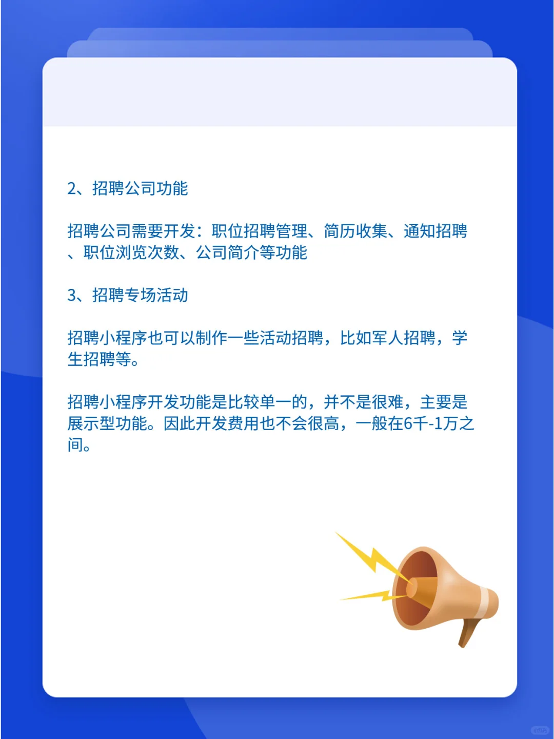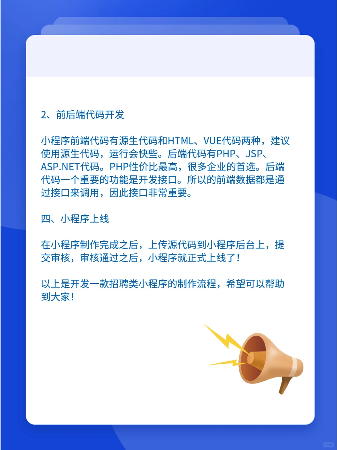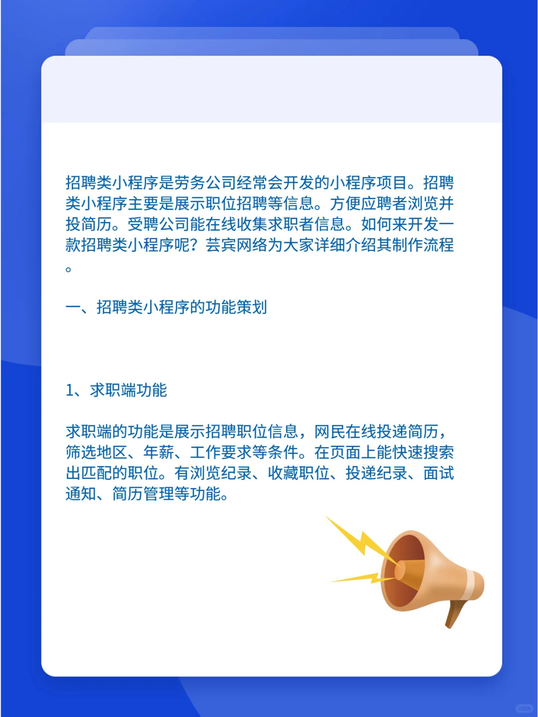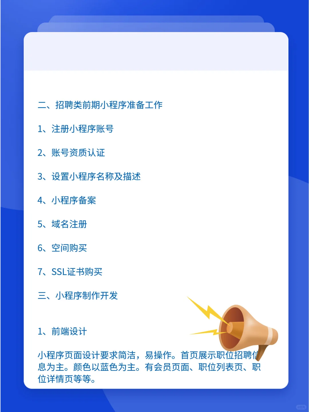 招聘类小程序开发流程 招聘类小程序是劳务公司经常会开发的小程序项目。招聘类小程序主要是展示职位招聘等信息。方便应聘者浏览并投简历。受聘公司能在线收集求职者信息。如何来开发一款招聘类小程序呢?芸宾网络为大家详细介绍其制作流程。 [赞R]一、招聘类小程序的功能策划 1、求职端功能 求职端的功能是展示招聘职位信息,网民在线投递简历,筛选地区、年薪、工作要求等条件。在页面上能快速搜索出匹配的职位。有浏览纪录、收藏职位、投递纪录、面试通知、简历管理等功能。 2、招聘公司功能 招聘公司需要开发:职位招聘管理、简历收集、通知招聘、职位浏览次数、公司简介等功能 3、招聘专场活动 招聘小程序也可以制作一些活动招聘,比如军人招聘,学生招聘等。 招聘小程序开发功能是比较单一的,并不是很难,主要是展示型功能。因此开发费用也不会很高,一般在6千-1万之间。 [飞吻R]二、招聘类前期小程序准备工作 1、注册小程序账号 2、账号资质认证 3、设置小程序名称及描述 4、小程序备案 5、域名注册 6、空间购买 7、ssl证书购买 [哇R]三、小程序制作开发 1、前端设计 小程序页面设计要求简洁,易操作。首页展示职位招聘信息为主。颜色以蓝色为主。有会员页面、职位列表页、职位详情页等等。 2、前后端代码开发 小程序前端代码有源生代码和html、vue代码两种,建议使用源生代码,运行会快些。后端代码有php、jsp、asp.net代码。Php性价比最高,很多企业的首选。后端代码一个重要的功能是开发接口。所以的前端数据都是通过接口来调用,因此接口非常重要。 [哇R]四、小程序上线 在小程序制作完成之后,上传源代码到小程序后台上,提交审核,审核通过之后,小程序就正式上线了! 以上是开发一款招聘类小程序的制作流程,希望可以帮助到大家! #小程序 #小程序制作开发 #招聘小程序开发 #小程序开发 #小程序制作 #小程序定制开发 |