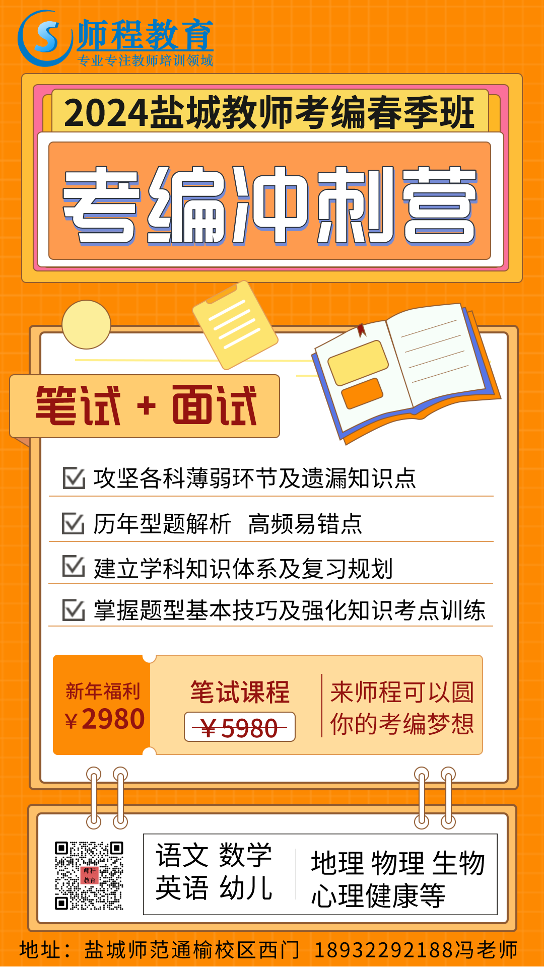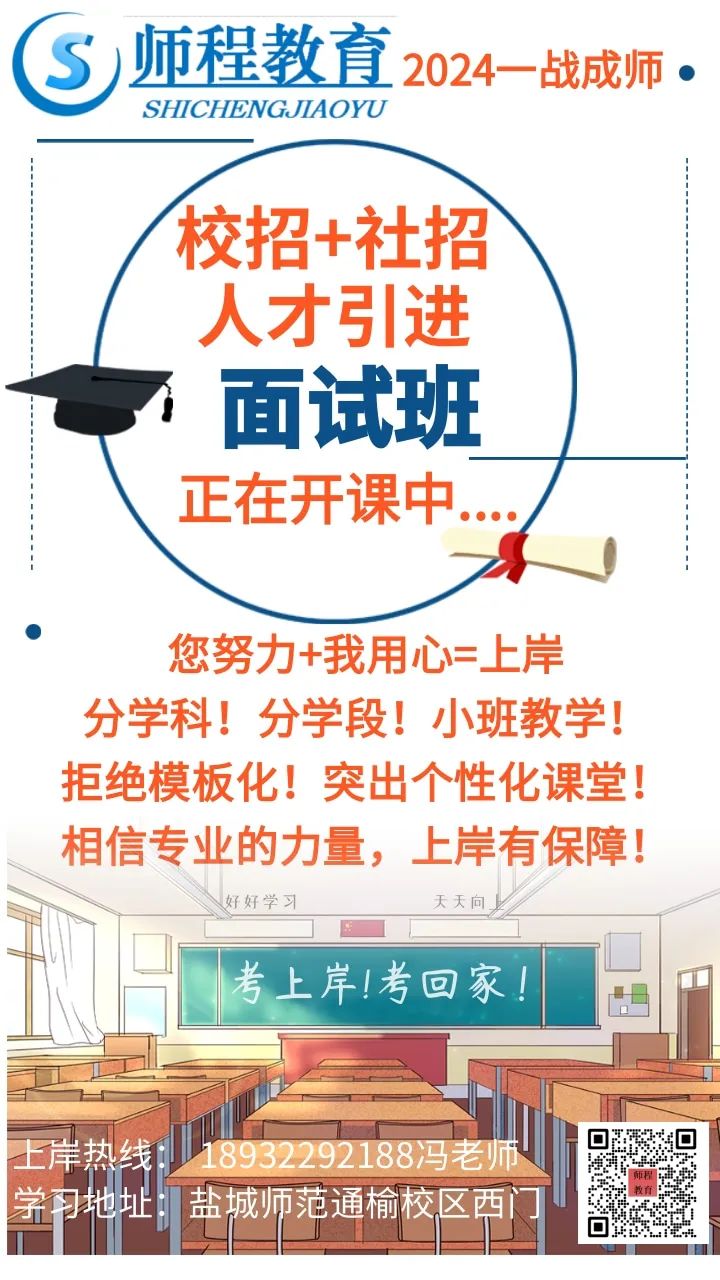 1 2024年招教笔试【刷题提升班】980元 🚩2024招教针对盐城|泰州|南通|淮安等地区,针对本土考情,知识点覆盖整个江苏! 👉笔试刷题实战班本周六(3月2号)开课啦! ♦️江苏校招+社招+人才引进【面试】班开课中! ♦️报名即可参加学习! ☎️上岸电话:18932292188冯老师 🚌师程地址:盐城师范通榆校区西门对面3楼 阜宁、滨海、东台、亭湖、兴化校招【面试班】 盐城地区人才引进【面试班】 江苏地区校招和社招【面试班】 面试提前学,上岸更轻松! 考情及报班咨询:冯老师 18932292188 盐城市亭湖区2024年第三批校园公开招聘教师11名 1.网络报名:2024年3月10日9:00—3月12日16:00 2..面试采取上微型课形式,应聘人员在学科组内按抽签顺序进行备课、上课,备课时间30分钟,上课时间10分钟,面试总分为100分,60分为合格线。面试主要考察应聘人员的教育教学水平、组织协调能力、个性心理、仪表举止等综合素质和语言表达、板书等教学基本功。 3.面试时间:2024年3月17日,具体地点另行通知。 ![]() 为加大高层次教育人才招聘力度,提高教师队伍素质,根据《江苏省事业单位公开招聘人员办法》(苏办发〔2020〕9号)文件精神,盐城市亭湖区教育局部分直属学校决定赴高校公开招聘具有硕士研究生及以上学历学位教师,现公告如下: 本次校园公开招聘计划11名。具体岗位计划及条件详见《盐城市亭湖区2024年第三批校园公开招聘教师岗位表》(附件1),可在亭湖区人民政府网站上查询(网址为:https://www.tinghu.gov.cn/)。 1.具有中华人民共和国国籍,享有公民的政治权利。 2.遵守中华人民共和国宪法和法律,拥护中国共产党领导和社会主义制度,热爱教育事业,遵纪守法,品行端正,具有良好的道德素养。 3.年龄不超过35周岁(1989年2月29日以后出生)。 4.身心健康,能适应相应教师岗位工作要求。 5.志愿在亭湖区教育局直属学校从事教育教学工作不少于3年。 6.报考岗位须持有与岗位学科一致且不低于岗位学段要求的教师资格证书(尚未取得教师资格证书者须提供认定机构或所在高校出具的已参加相应教师资格认定的证明,或提交个人承诺书(见附件4),承诺在2024年8月31日前取得应聘岗位所需的教师资格证书,否则不予聘用)。 7.具备《盐城市亭湖区2024年第三批校园公开招聘教师岗位表》中岗位要求及资格条件: 2024年毕业生指在2024年毕业并已取得学历(学位)证书,且仍无工作单位的人员。其中,能够提供《毕业生就业推荐表》(原件)的普通高校毕业生,取得学历(学位)证书的日期可放宽至2024年8月31日;国(境)外同期毕业人员,取得学历(学位)证书的日期可适当放宽,但须在2024年12月31日前取得国(境)外学位并完成教育部留学服务中心学历认证。 2022年和2023年普通高校毕业生,若仍未落实工作单位,其档案关系仍保留在原毕业学校,或保留在各级毕业生就业主管部门(毕业生就业指导服务中心)、人才交流服务机构和公共就业服务机构的,以及国(境)外同期毕业且已完成学历认证但仍未落实工作单位的人员,可应聘面向2024年毕业生岗位。 参加基层服务项目的人员,如参加服务项目前无工作经历,服务期满且考核合格后2年内的,可应聘面向2024年毕业生岗位。 以普通高校应届毕业生应征入伍服义务兵的人员,退役后1年内的,可应聘面向2024年毕业生岗位。 应聘人员研究生阶段所学专业须符合招聘岗位的专业要求(专业目录按教育部《普通高等学校本科专业目录(2020年版)》《授予博士、硕士学位和培养研究生的学科、专业目录(1997年颁布)》和《学位授予和人才培养学科目录(2018年)》等执行)。 专业目录和招聘条件中都未列出的专业、留学人员的毕业专业,由招聘单位或其主管部门根据招聘公告中明确的专业条件、应聘人员所学专业课程、研究方向等认定是否符合招聘岗位的专业要求。专业名称已经调整的专业,如调整前或调整后的专业符合招聘岗位的专业要求,毕业院校以书面形式证明调整前后的专业为同一专业或专业课程基本一致,视为符合专业要求。 8.取得祖国大陆全日制普通高校学历的台湾学生和取得祖国大陆承认学历的其他台湾居民应聘时按国家和江苏省的有关规定执行。 9.本次公开招聘没有户籍限制。 10.有下列情形之一的,不得应聘: (1)现役军人或普通高校在读非2024届毕业生; (2)尚未解除纪律处分或者正在接受纪律审查的人员、刑事处罚期限未满或者涉嫌违法犯罪正在接受调查的人员; (3)办理聘用手续前,5年服务期未满的新录用公务员或有规定(含协议明确)不得解聘离开工作单位(岗位)的人员,或国家和省另有规定不得应聘到事业单位的人员。 组织报名 本次招聘在西南大学设考点,符合报名资格条件的考生根据报考岗位代码进行网上报名,报名、材料扫描上传、资格初审确认,均通过网络进行,时间为2024年3月10日9:00—3月12日16:00(双休日接受咨询与报名),考生可通过电脑端登录盐城市亭湖区教师招聘系统(网址:http://th.zp885.top:9100/ ),注册后即可报名,应聘者只能报考一个岗位。 联系人:袁老师,15261982465 焦老师,18351272996 现场确认 报名成功后须至现场确认,时间为2024年3月16日8:00—18:00,地点:西南大学北碚校区(北碚区天生路216号,5号门进)26号教学楼201教室。考生因特殊情况未进行网上报名,亦可于3月16日8:00—18:00现场报名。逾期未报名并确认者视为主动放弃。 资格审查 资格审查在现场确认时