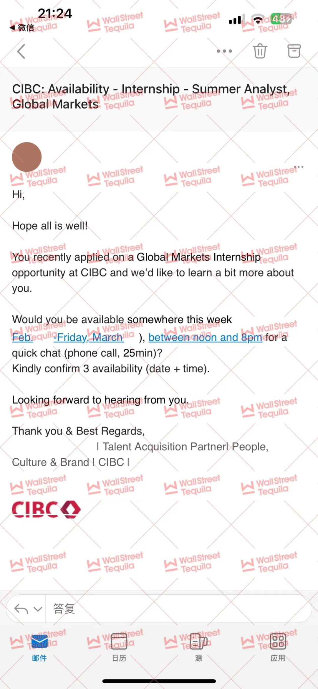 加拿大五大行CIBC正在发London Office 2024 Global Markets Summer Intern 一面邀请! 👇👇 University College London Class of 2025 CIBC CIBC是由Canadian Bank of Commerce(1867年创立)与Imperial Bank of Canada(1875年创立)于1961年合并而成,总部设在多伦多市,是加拿大第五大商业银行。进到90年代,加拿大帝国商业银行有效地调整指导方针,发展更加专业化的业务,包含证券化、私募、合并与回收、公司的重新组合、设备租赁和与利率及外汇管理相关的财务业务。CIBC是并购咨询、债务和股权融资、企业银行、交易、对冲和研究领域的领先服务商。 cr. CIBC官网 CIBC的内部架构主要可以分为以下四大类:Advisory、Client Service、Digital and Technology以及Functional Groups。其中,Wealth Management与Capital Markets & Commercial Banking业务组都属于Advisory。 cr. CIBC官网 WST共有8位学员被CIBC录取~ 想知道投行的面试官都会问些什么? 投行面经合集来啦 测一测你能否进入投行哦~ 面经获取方式 扫描下方二维码回复【投行】 即可限时24小时免费领取投行面经一份 学生所参加的求职项目 【WST投行项目】 2015-2023求职季 进入知名投行的WST学生参加了这个项目 在WST,八大投行的offers是可以批量生产的 ⬇️⬇️⬇️ WST职业教育进入第十一个年头! WST创始人受邀参加CCTV节目,对话央视一姐朱迅 ▼点击这里,更多求职资讯尽在WST |