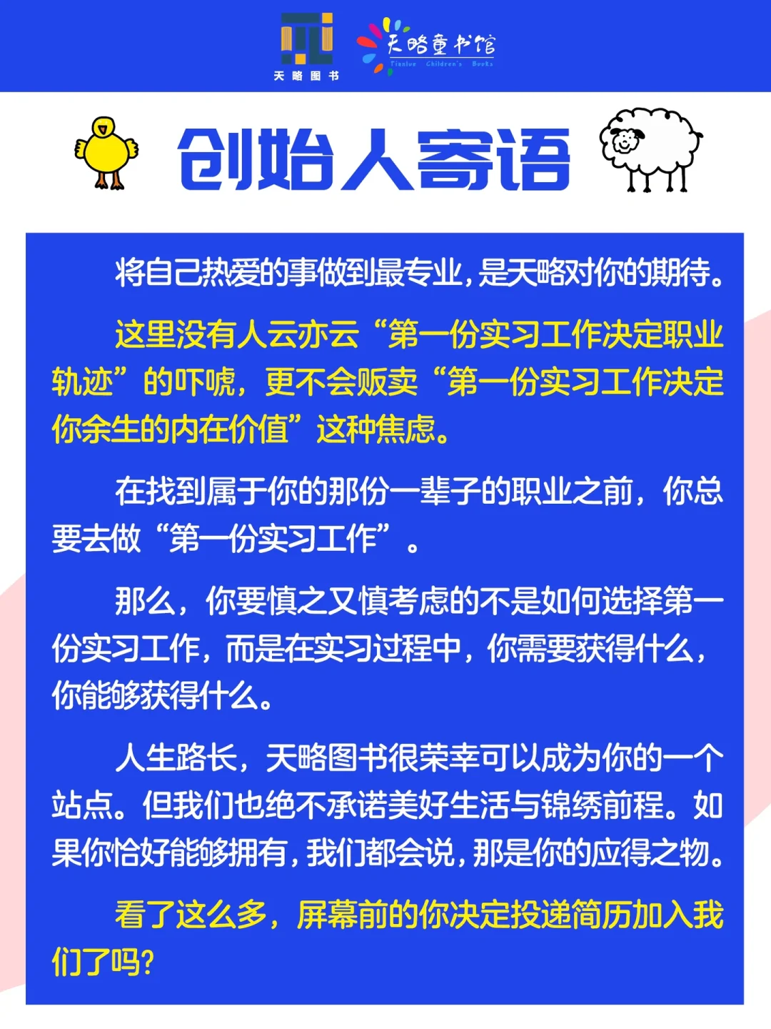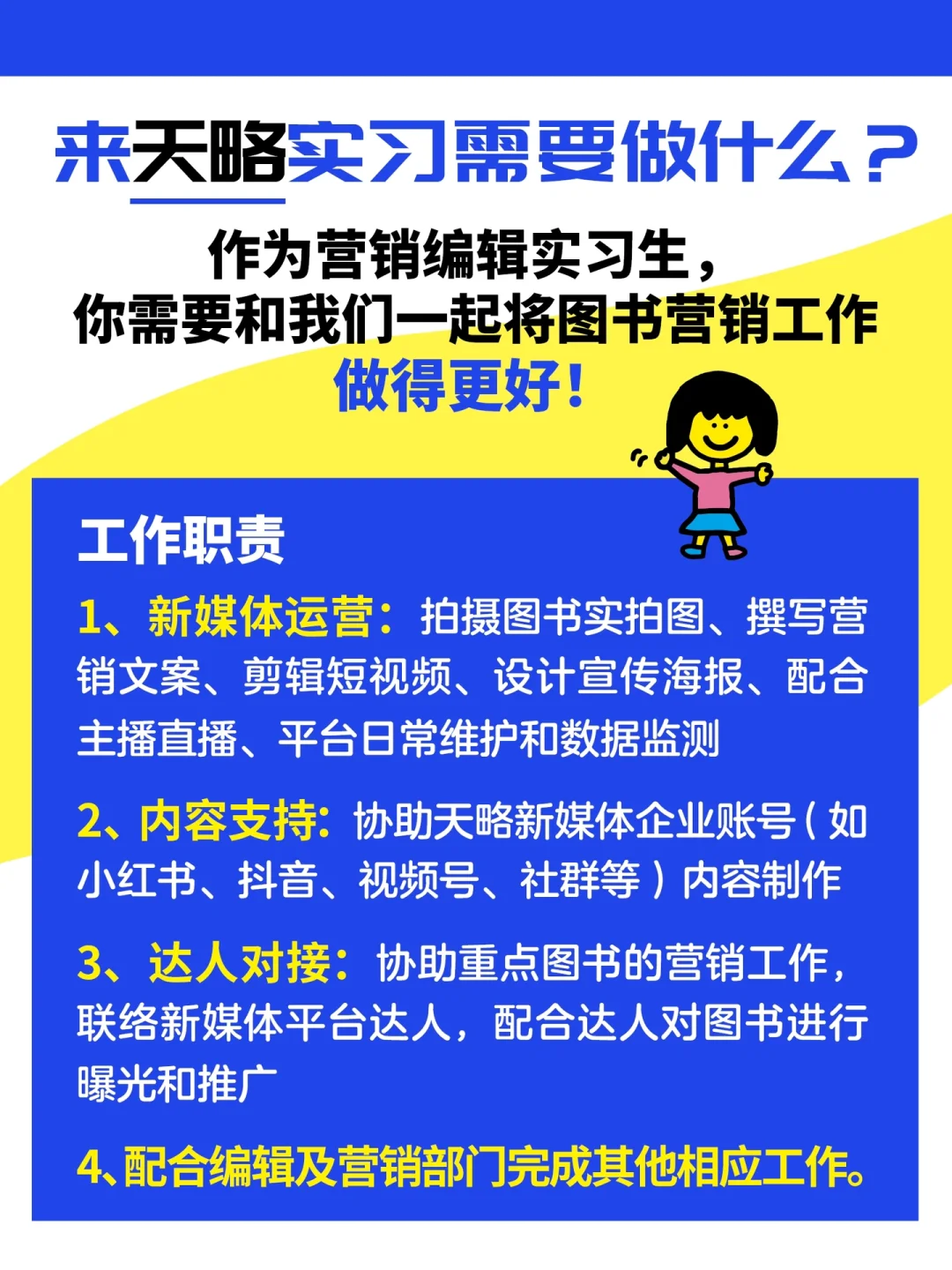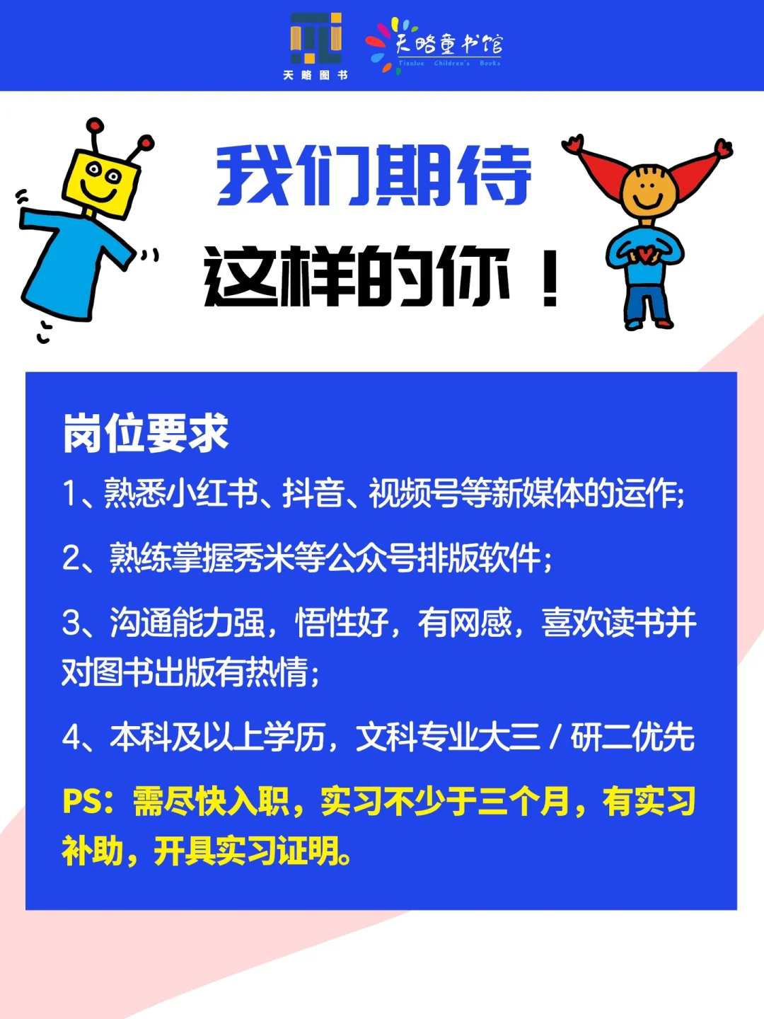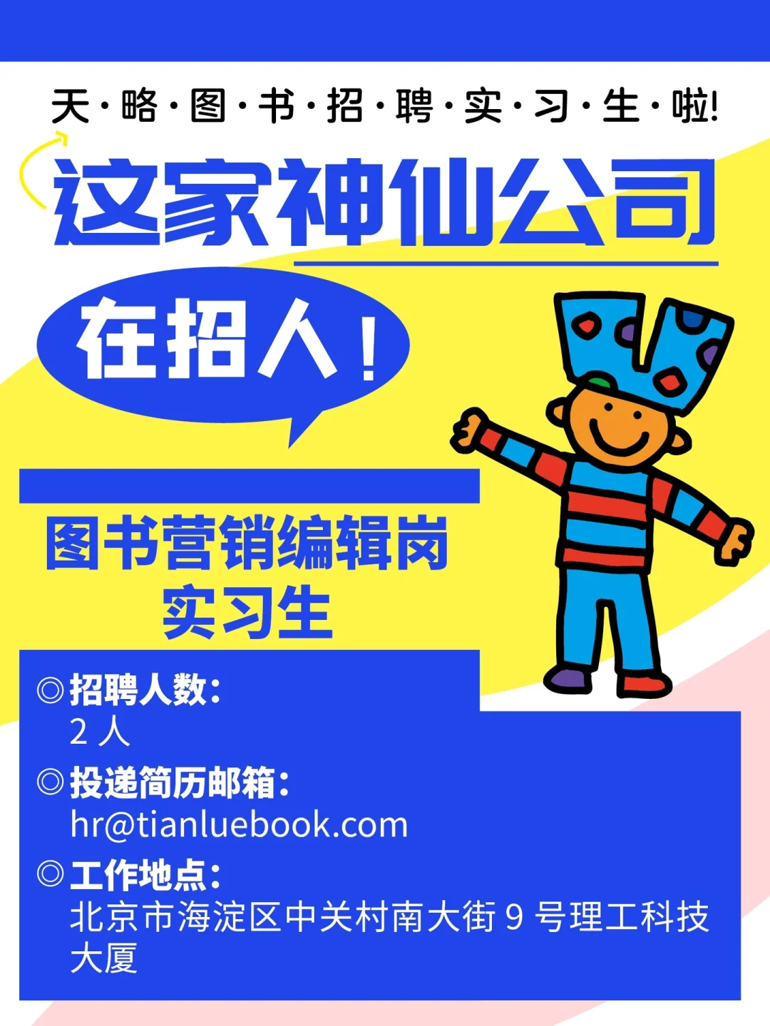 天略招实习生❗️大家庭期待你的加入🙋🏻♀️ 你没看错[斜眼R]天略在招人❗️ 2个营销编辑实习岗位等你来🙋🏻♀️ 岗位要求、工作职责、品牌介绍都在上面几张图中,不赘述啦[飞吻R] [向右R]小天重点说说:来天略实习有多香! [一R]带薪看书,用绘本治愈童年 [二R]不卷不焦虑,跟996说不! [三R]全世界最好的老板,包容、平等、尊重每一位员工 [四R]公司体量不大,不用担心勾心斗角“宫斗剧” [五R]同事们都很真诚很温暖(尤其是小天[萌萌哒R]谁能不爱小天本天呢) [六R]行业内有竞争力的实习补助,对得起你的付出(这是可以说的吗[doge]) [七R]交通便利!地铁魏公村站下车,步行1分钟即可到达!大冬天打工人通勤的痛我们懂~ 还有很多~等你来了就知道了[猪头R] 所以,有意向的伙伴,快快加入这个大家庭吧[举手R] #工作招聘 #求职 #令人心动的实习日记 #实习 #出版社实习 #天略图书 #天略童书 #天略招聘实习生 #营销编辑 #我的实习生活 #实习内推 #大学生实习 #实习日常 #编辑 #简历 #文科生 #出版专业 #校园薯 #打工人 #留学生求职#拒绝焦虑 #拒绝内卷 #神仙公司 #为读者提供价值 |