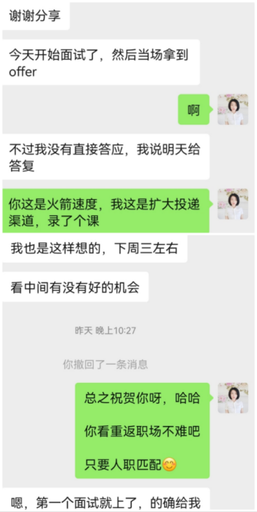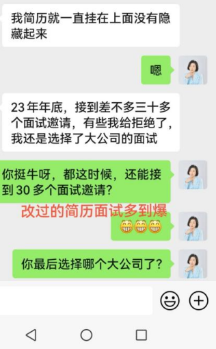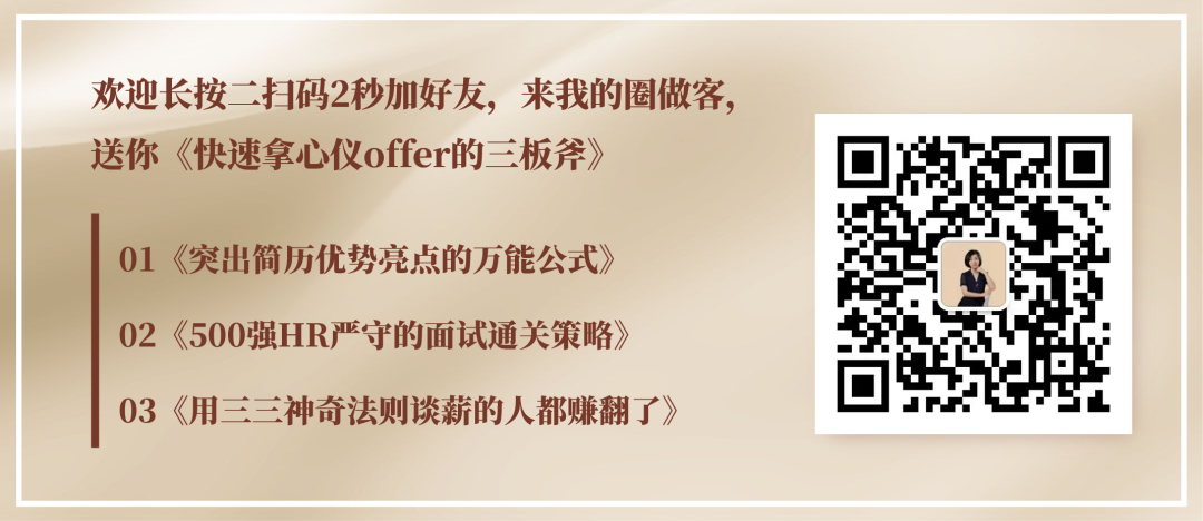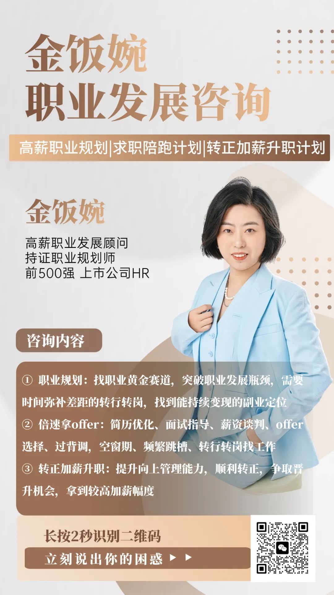 (读完觉得有收获,欢迎转发、拉到文章最下方,右下角点“赞”和“在看”!) 点击👇下方卡片关注,之后点击右上角“…”→设为★星标★升职加薪快人一步 参加工作3年 ,一位在北京做人事专员的校友回来,他说他的目标是要面试100家公司,结果面试完了之后,成功找了一个主管级别的工作 我在原公司当人资主管一年半,工资5000,先是平移跳到一家外资企业工资涨到7800,然后一年内又跳槽到一家企业升职为经理薪资12000,成功薪资翻倍 你有没有发现只会埋头做事的人往往没有太多机会,反倒是那些看起来不太老实的人却能拿offer,找到好工作? 以前一位在外资500强工作的HRD也告诉过我,有一类人面试时很会包装自己,能把平淡无奇的工作讲得天花乱坠🤔 怎么拿到升职加薪的offer的,成为“面霸”,实现“面试自由”? 你好,我是金饭婉,做过12年500强和上市公司HR,现在又做职业发展顾问,帮助1027名小伙伴,找准职业黄金赛道,成功求职 很多客户进入阿里、字节、腾讯、蔚来汽车、小红书等知名公司 金三银四到了,会面试的人永远不愁拿不到offer,找不到好工作‼️ 建议你,有事没事一定要多去面试,因为真的好处多多👇 大部分人根本不会表达,经常别人问东他说西,说不到点子上,面试官根本没耐心听你说什么 当年张勇面试阿里CFO,马云煮好了一壶茶跟张勇在办公室里谈情怀、谈做人、谈趋势 当烧开的茶水已经将气氛完全烘托起来,马云突然天马行空问了一句“你为什么要来阿里巴巴?” 张勇略显紧张,但他很快镇定下来,简单干练的说:“我已经干过一家30亿美金的企业,我想再干一个300亿美金的事业”。 马云听完笑而不语,但显然张勇征服了马云 虽然我们不能人人成为像张勇这样的天选打工人,但多去面试能倒逼你正视自己的表达能力和总结能力 当你能把工作的背景、过程和结果价值说清楚,立马在一众求职者中脱颖而出,你拿offer,是天意 2⃣提升个人思辨能力 思辨能力是职场的重要技能。厉害的面试官会通过各种意想不到的发问,来测试你的思考能力和临场反应能力。 我的客户在找到我之前,有一次面试红圈所,遇到了很厉害的面试官,一上来就问 “你能否用最通俗易懂的语言讲你专业领域的知识,让保洁阿姨也能听懂”? 她说,她听到这个问题,当时整个人差点懵了。 后面找我做面试辅导时,我告诉她高层注重“概念技能”,他需要的不是人选站那说一堆,而是表达要有画面感和影响力 既然你聘的岗位很重要,未来要成为高潜人才,就要具备这个能力 然后我们就这个话题交流了20多分钟,她突然发现新思路,整个人都被打开了💯 面试官的持续拷问是对求职者最大的考验,它让你知道自己的市场价值,找到自己的优劣势,做出蕞优的职业判断。 当初我是专员,在大公司做螺丝钉时候,就到处去面试主管和经理的岗位,所以经常遇到面试官的灵魂拷问,“你觉得专员和经理蕞大的区别是什么?” 这些问题到逼我去思考,然后我回去就把我经理的KPI,打印出来贴在墙上,逐一对照,看哪些能力,还没有机会炼,怎样找机会炼 所以才有了前面一年跳槽二次,薪资翻倍的结果