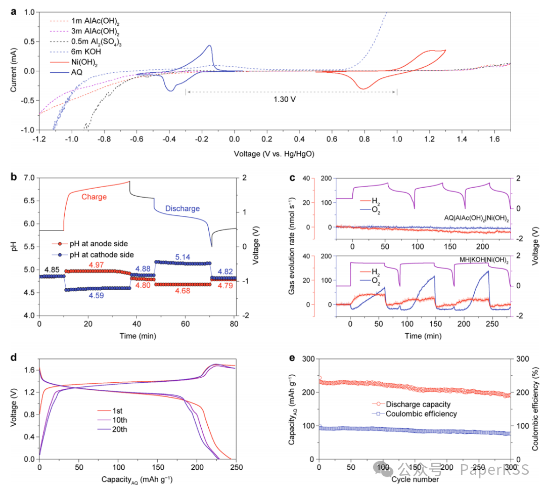 可充电水系电池由于其高安全性和低成本,使其作为一种潜在的大规模能源存储系统。然而,开发具有高可持续性和可逆性的水系电池是具有挑战性的。 本研究中,南开大学陈军院士等人报道了一种两性羟基乙酸铝(AlAc(OH)2)电解液,其具有H+和OH−的双极电解化能力,有助于蒽醌(AQ)负极和氢氧化镍(Ni(OH)2)正极的氧化还原反应。其中,AlAc(OH)2(H2O)3溶剂化结构的双极电离能力是Al3+和OH−的强极化能力的结果。 在解离常数为5.0/3.0时,H+/OH−的解离能力强于水(14.0),提高了电极的氧化还原反应。具体来说,H+的吸收阻止AQ负极离子键的形成,抑制电极溶解,而OH−为Ni(OH)2正极的稳定转化反应提供了局部碱性环境。进一步验证,设计的AQ||Ni(OH)2电池的AQ负极放电容量为243.9 mAhg-1,循环300次容量保持率为78.2%。 此外,作者组装了一个放电容量为0.90 Ah的软包电池,基于电池的总质量展现出44.7 Whkg-1的能量密度。这项工作显著地拓宽了水系电池的类型,并代表了双极电解液的设计理念和与H+和OH−进行的独特的电化学反应。 相关文章以“Sustainable Aqueous Batteries Based on Bipolar Dissociation of Aluminum Hydroxyacetate Electrolyte”为题发表在J. Am. Chem. Soc.上。