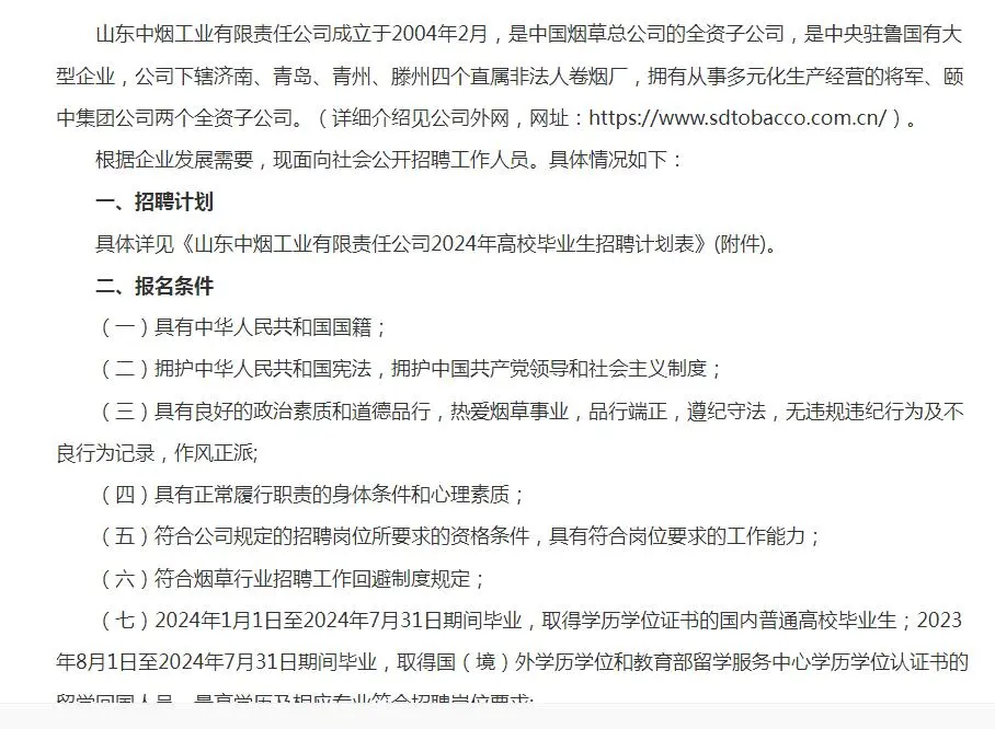 山东中烟工业有限责任公司高校毕业生招聘238人,报名时间为2024年3月1日-3月14日!国企呀宝子们!冲~