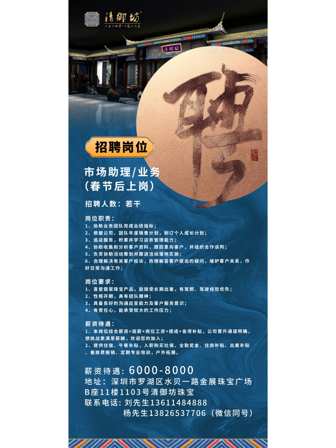 1、喜爱翡翠珠宝产品,能接受长期出差,有驾照、驾驶经验优先;2、性格开朗,具有团队精神;3、具备良好的沟通应变能力及客户服务意识;4、有责任心,能承受较大的工作压力;