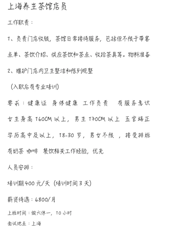 要求:健康证 身体健康 工作负责 有服务意识 女生身高160CM以上,男生170CM以上 五官端正 学历高中及以上,18-30岁,男女不限 ,接受排班 有奶茶 咖啡 餐饮相关工作经验,优先