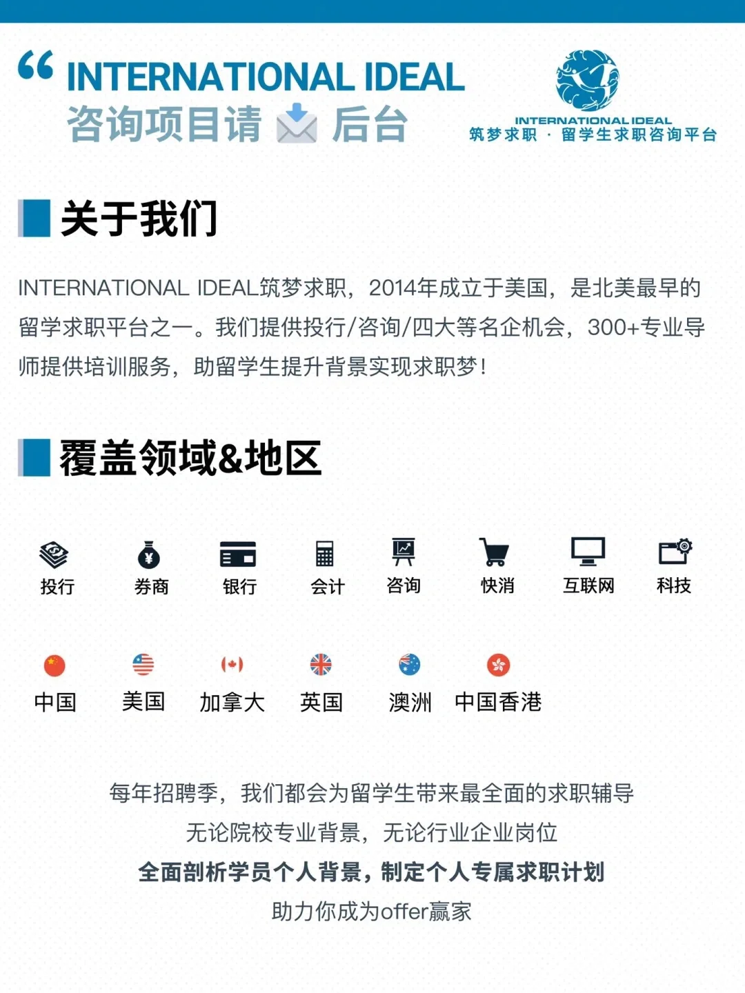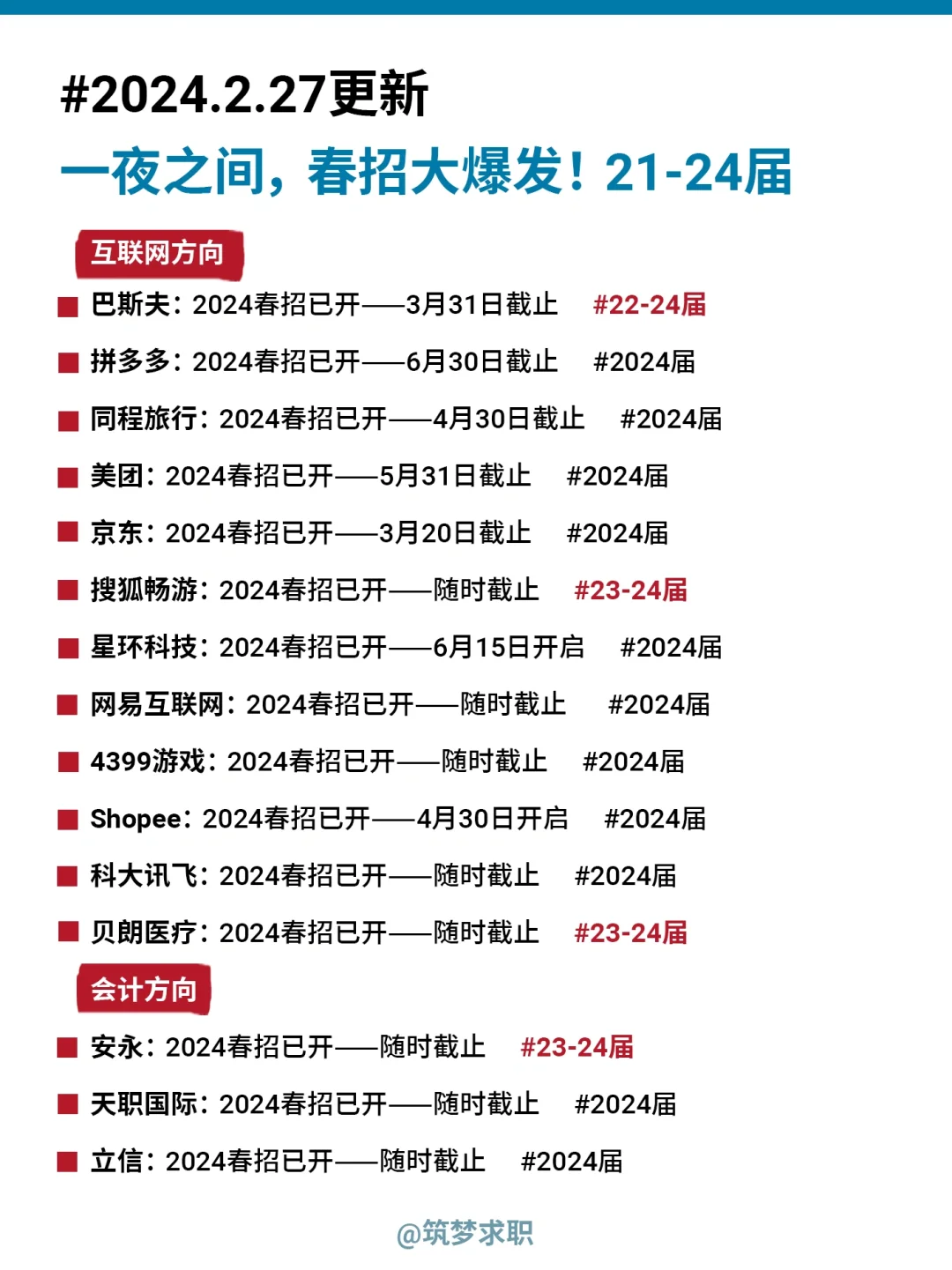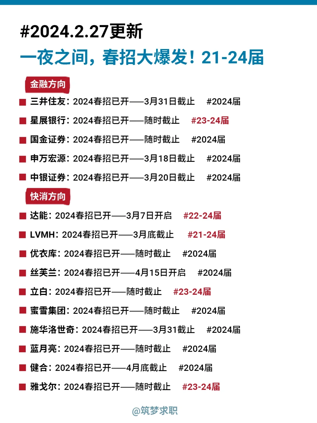 不是吧😍春招一夜全开了🎊投不完‼️ 一觉醒来变天了,春招大爆发,仅一天时间全开了‼️ 🥳等春招的同学,建议现在机会多的时候海投,春招是进名企的蕞后机会了... 👉小i已经帮大家整理好了金融、会计、快消、奢侈品、互联网等热门方向的春招企业,开启的有:国金证券、申万宏源、安永、丝芙兰、Shopee...详情可滑动图片查看哦 👉还有像达能、LVMH、巴斯夫等外企均是往届可投递,22-24届冲 网申直达🔗+春招汇总表🎁分享给大家,包含招聘详情,实时更新一键直达,拒绝春招信息差~ 🍎🚢【春招】or📩@筑梦求职 #INTERNATIONALIDEAL #筑梦求职#春招 #2024届春招 #银行春招 #2024春招 #香港留學 #美国留学生 #英国留学生 #澳洲留学生 #加拿大留学生 #春招分享 #留学生春招 #2024届校园招聘 |