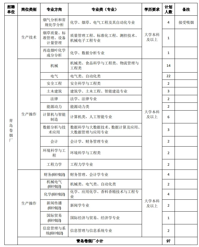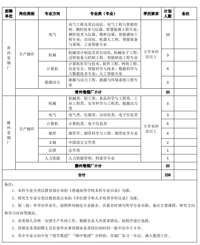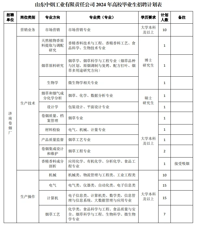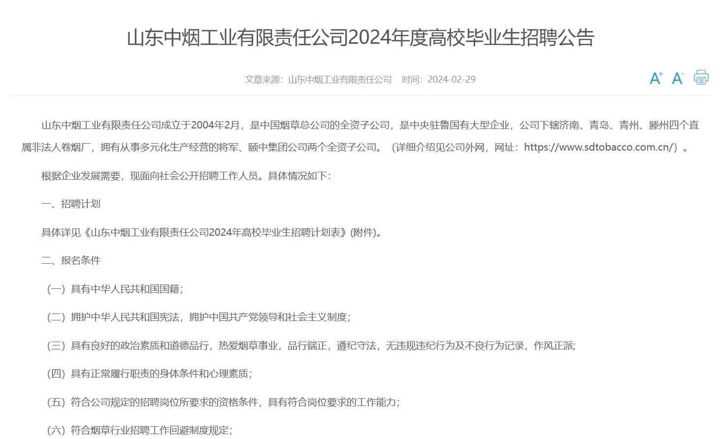 24山东中烟工业招聘公告 1、报名时间:报名时间为2024年3月1日-3月14日。 2、报名方式:登录山东中烟人才招聘系统(http://zhaopin.sdtobacco.com.cn/yythr-rec/website/ui/resume/index.html#/),填报相关信息进行网上报名。原则上不接受到企业现场报名。 每名应聘者限报考一个岗位,其中专业方向中有“将军集团”“颐中集团”字样的,在烟厂实习一年后,调入集团工作。应聘者应按要求在相应时间内填写报名信息,所填内容及提交的申请材料应当真实、准确、完整,不符合报考资格条件的请勿报名。 3、笔试 公司委托第三方机构负责组织笔试。笔试成绩满分为100分,笔试内容分综合能力和专业知识,按照“干什么,考什么”原则,合理设置考试内容,符合岗位要求。 笔试具体时间、地点另行通知,原则上安排在济南。同一招聘单位各专业方向招聘岗位计划人数与资格审查符合条件人数须达到1:3才能笔试(博士招聘不设定限制比例,下同),未达到规定比例的,相应递减招聘岗位计划人数至规定比例,无法递减的,取消该岗位招聘。#烟草 #烟草专卖局 #国企招聘 #事业单位招聘 #教育 #高端就业 #烟草专卖局 #江苏中烟工业 #山东烟草 #山东中烟 #山东中烟工业 #江苏中烟工业 |