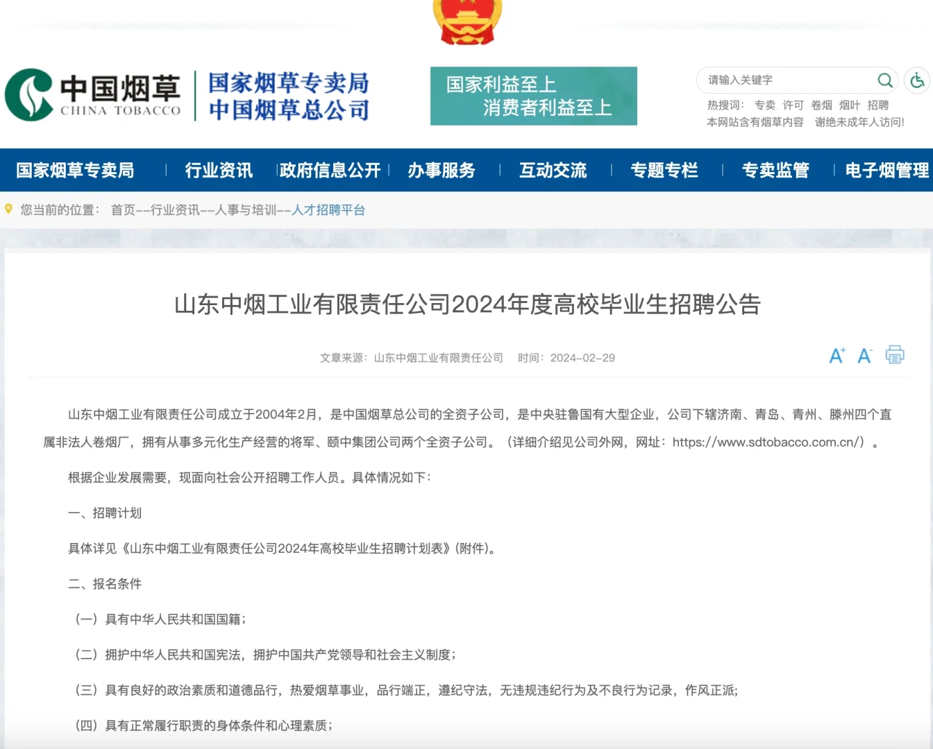 最新招聘⛷山东中烟工业招聘高校毕业生‼️ 📣 2024年度山东中烟工业有限责任公司高校毕业生招聘238人 ✔️ 山东中烟工业有限责任公司成立于2004年2月,是中国烟草总公司的全资子公司,是中央驻鲁国有大型企业 ✔️报名条件:2024年1月1日至2024年7月31日期间毕业,取得学历学位证书的国内普通高校毕业生;2023年8月1日至2024年7月31日期间毕业,取得国(境)外学历学位和教育部留学服务中心学历学位认证书的留学回国人员。最高学历及相应专业符合招聘岗位要求;本科毕业生年龄应在25周岁及以下(1999年7月1日及以后出生),硕士研究生年龄应在28周岁及以下(1996年7月1日及以后出生),博士研究生年龄应在33周岁及以下(1991年7月1日及以后出生)。 ✨报名时间3月1日-3月14日 ✨笔试:笔试内容分综合能力和专业知识 ✨面试:主要测试应聘人员能力素质、专业知识、个性特征以及与报考岗位的匹配度等。 #烟草 #国企招聘 #国企央企 #工作 #高端就业 #中国烟草 #招聘 #烟草招聘 #烟草考试 #烟草 #找工作 #找工作啊找工作 #高校毕业生 |