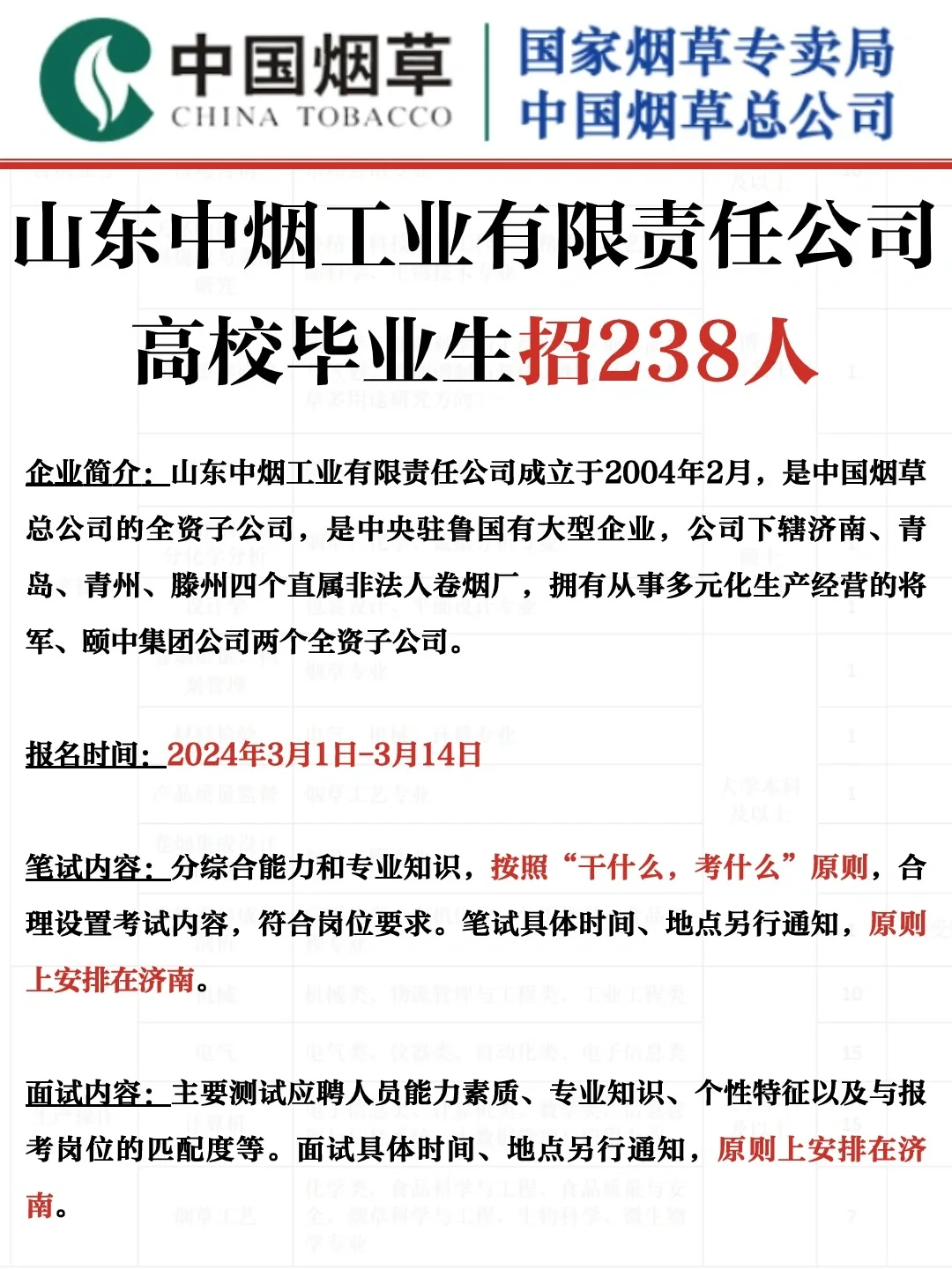 神仙单位🔥山东中烟招聘公告发布‼️ 🏃企业简介:山东中烟工业有限责任公司成立于2004年2月,是中国烟草总公司的全资子公司,是中央驻鲁国有大型企业,公司下辖济南、青岛、青州、滕州四个直属非法人卷烟厂,拥有从事多元化生产经营的将军、颐中集团公司两个全资子公司。 ⏰报名时间:2024年3月1日-3月14日 📝笔试内容:分综合能力和专业知识,按照“干什么,考什么”原则,合理设置考试内容,符合岗位要求。 🏃笔试具体时间、地点另行通知,原则上安排在济南。 📝面试内容:主要测试应聘人员能力素质、专业知识、个性特征以及与报考岗位的匹配度等。 🏃面试具体时间、地点另行通知,原则上安排在济南。 #烟草 #烟草专卖局 #国企招聘 #高端就业 #国企央企 #铁饭碗 #国企 #好工作 #烟草考试 #烟草招聘 #烟草笔试 #山东烟草 #中国烟草 |