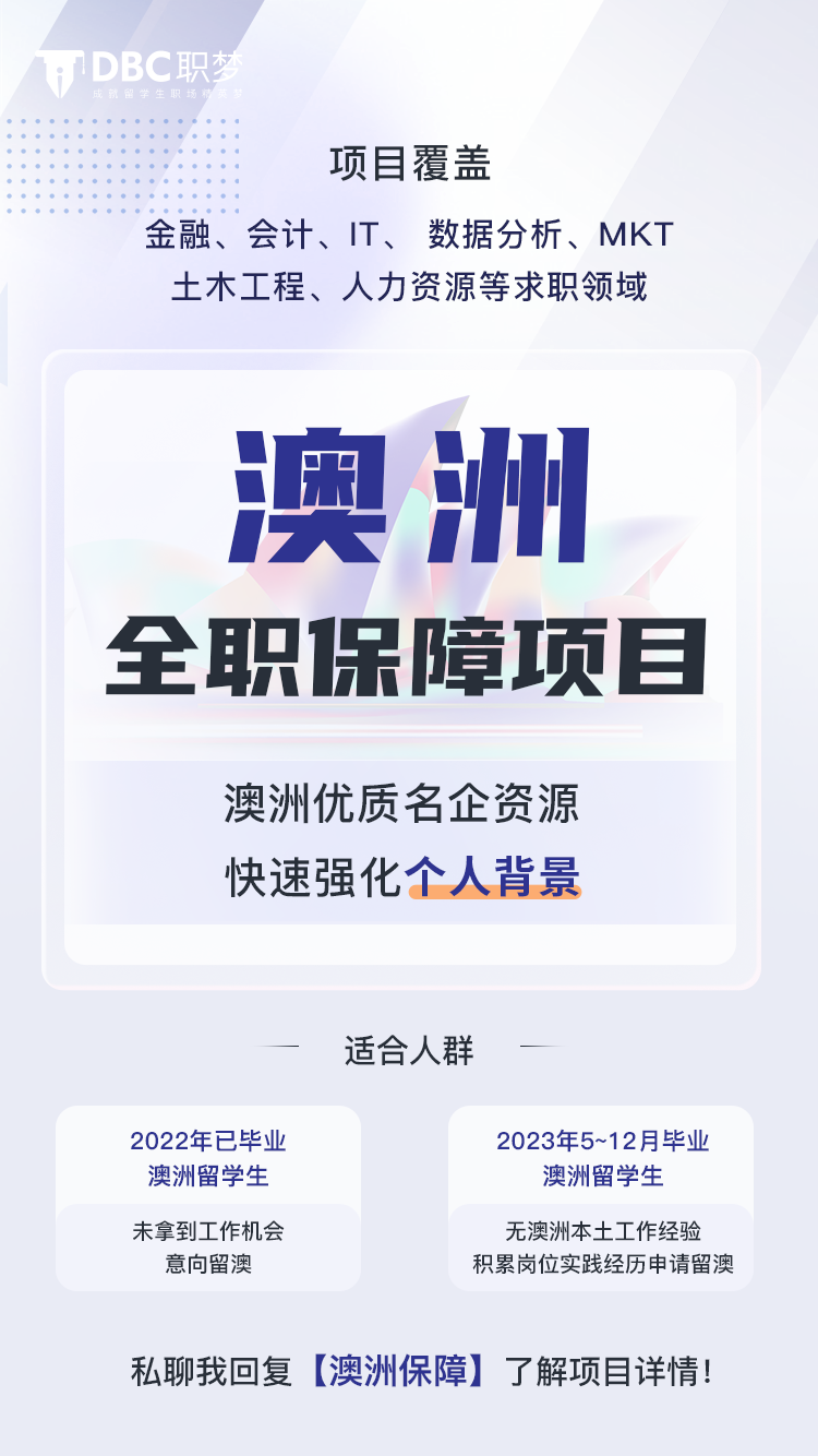 The candidate must be based in Melbourne, Australia or able to relocate. Fluent in both Mandarin and English to effectively communicate and collaborate in a bilingual work environment. Available for an interview with the company in December 2023 as part of the selection process. Available to start the internship program around February 2024 and commit to the specified duration. 👨🎓23年已经毕业或24-27年毕业,还没有拿到offer,但想留澳工作的澳洲应届留学生今天DBC职梦带着满满诚意,向你推荐全新求职项目——澳洲全职保障项目本次全新打造的澳洲全职保障项目,旨在让还没拿到offer,但想要留澳求职的澳洲留学生,通过实习转正的方式拿到澳洲全职offer。本次澳洲全职保障项目的目标企业为:澳洲本地的中小型公司,涵盖7大行业:*如果你的专业不在以上行列之中,我们也能帮你实现跨行业求职 DBC职梦学员斩获offer数量突破11127张!在2024招聘季DBC职梦学员共计拿到1042张名企offer!DBC职梦将继续秉承“成就留学生职场精英梦”的初衷「求真务实」是我们整个企业一直践行的价值观,我们坚持1张1张的积累,杜绝任何环节的虚假增长。 |