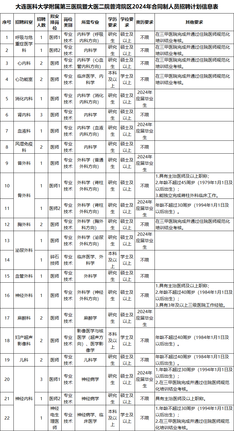 ● 单位简介 更多详细介绍,可进入医院官网查阅 大连医科大学附属第三医院暨大医二院普湾院区位于辽宁省大连市普兰店区世纪路西段 378 号,地处我国第 10 个国家级新区—金普新区的核心区域,临近中国(辽宁)自由贸易试验区大连片区,依山傍海,环境优美,交通便利,配套完善。附近沈海高速、哈大高铁、皮长高速以及大连快轨13 号线、金普高铁站毗邻其中,距大连主城区中心 60 公里,距普兰店老城区 5 公里,距规划中的大连金州新机场 20 公里。 医院总占地面积 13.4 万平方米,建设共分为两期。一期占地面积 8.84 万平方米、建筑面积 13.23 万平方米,设置床位 1000 张,包括住院部 A 座、门急诊医技综合楼、感染科楼等,现已建成完工。二期占地面积为 4.53 万平方米、规划建筑面积为 6.77 万平方米,拟增设床位 1000 张,包括住院部 B 座和行政后勤科教楼。 ●招聘简章 招聘来自官方渠道,可查阅文后来源网址 |