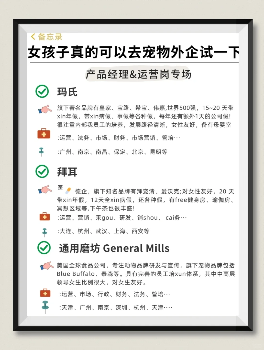 建议所有女性都大胆去宠物外企试试。最近几天不少外企、互联网公司、新开的中小厂都在招聘。很多宠物外企对女性非常友好,想要进外企的姐妹们可以尝试一下。