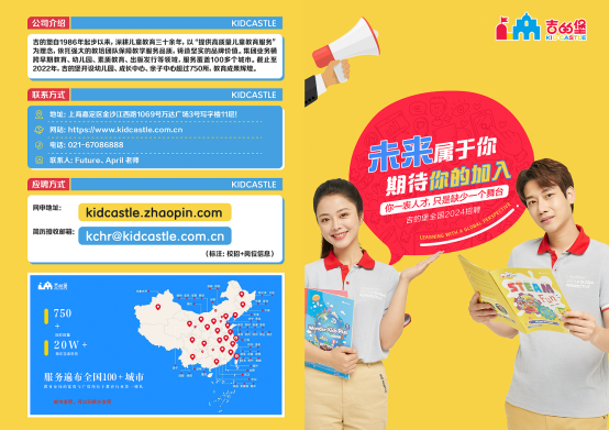 吉的堡教育集团(KID CASTLE)自1986年起步以 来,深耕儿童教育三十余年,以“提供高质量儿童 教育服务”为理念,依托强大的教培团队保障教学 服务品质,铸造坚实的品牌价值。