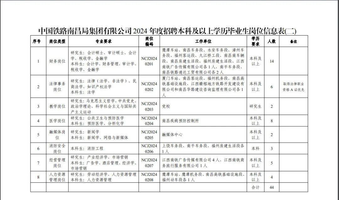 中国铁路南昌局集团有限公司根据企业发展需要,拟招聘普通高等院校本科及以上学历毕业生,现将有关事项公告如下: