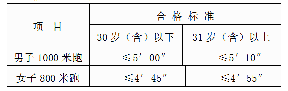 报名资格审查合格的考生方可参加体能测试(具体时间待通知,请提前做好准备)。测试项目为“男子1000米跑”“女子800米跑”,只允许当场测试一次,结果分为合格和不合格。测试标准如下: