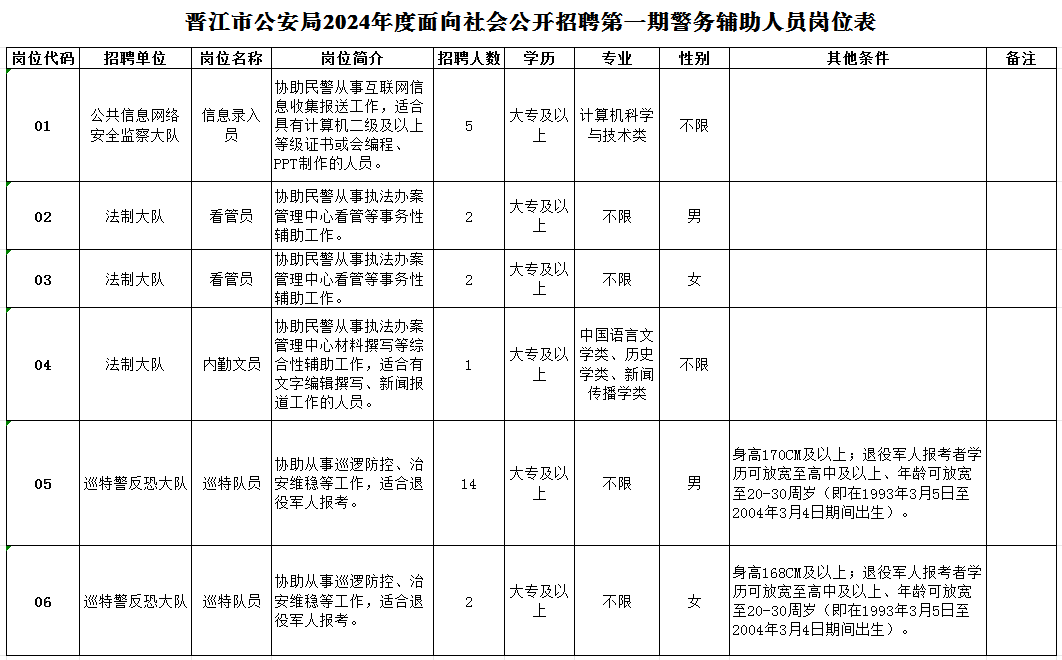 附件1:晋江市公安局2024年度面向社会公开招聘第一期警务辅助人员岗位表.xls