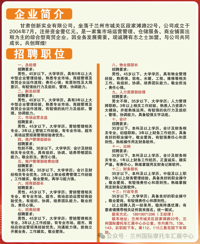 甘肃创新实业有限公司,坐落于兰州市城关区段家滩路22号,公司成立于2004年7月,注册资金壹亿元,是一家集市场运营管理、仓储服务、商业铺面出租为主的综合型商贸企业。因业务发展需要,现诚聘有志之士加盟,与公司共同成长,共创辉煌!