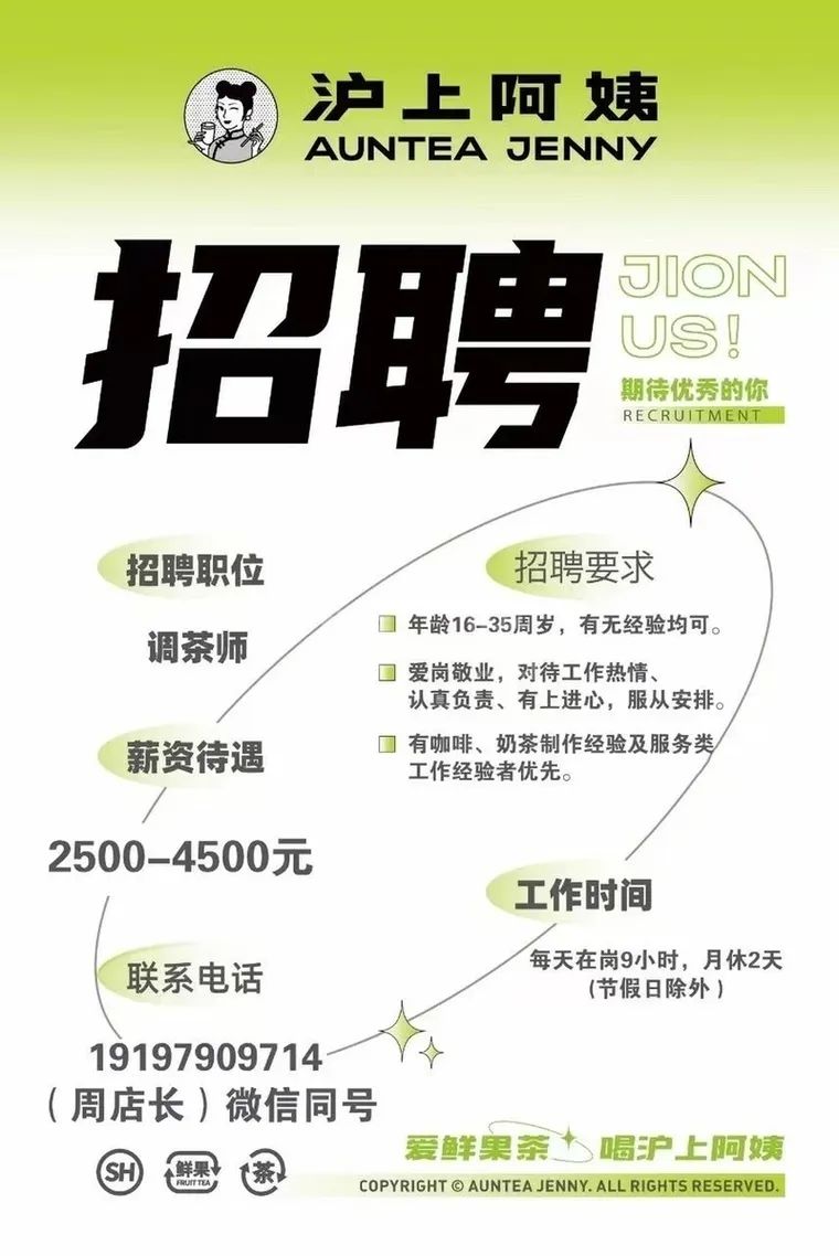沪上阿姨鲜果茶诚聘