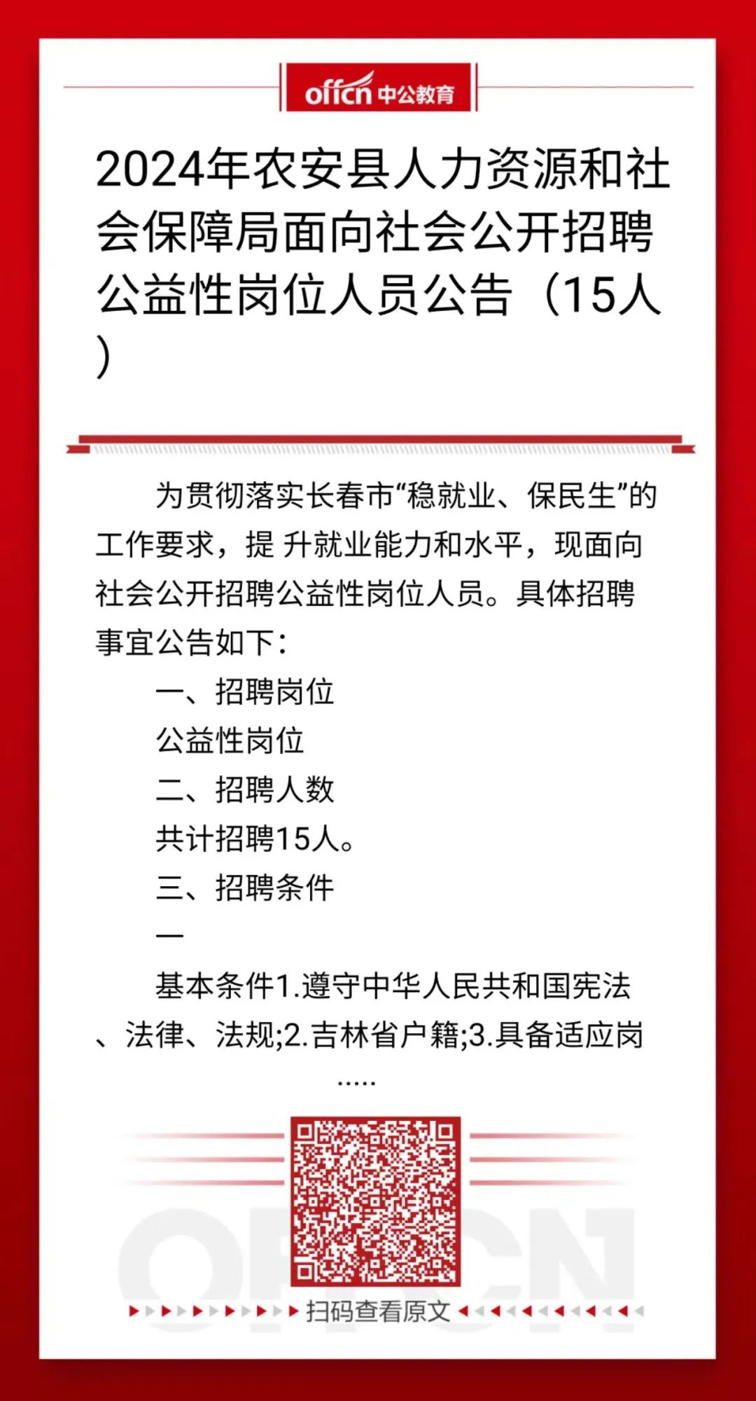 2024年农安县人力资源和社会保障局面向社会公开招聘公益性岗位人员公告(15人)