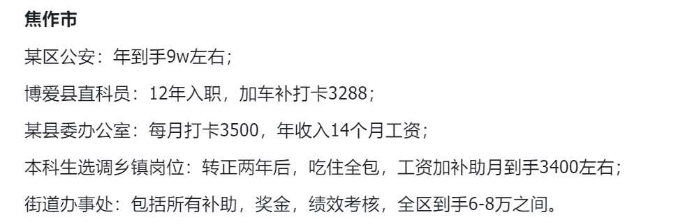 总体来看,在河南焦作公务员待遇大概在6-10万左右。当地这工资待遇,我认为可能还是地方财政压力太大了,导致各种补贴和绩效都停发。
