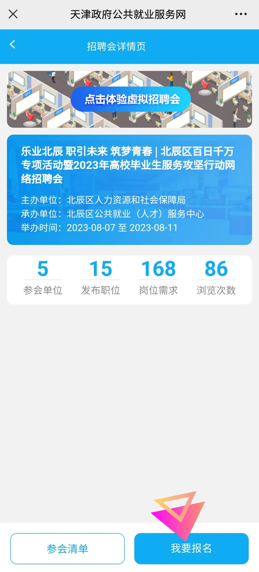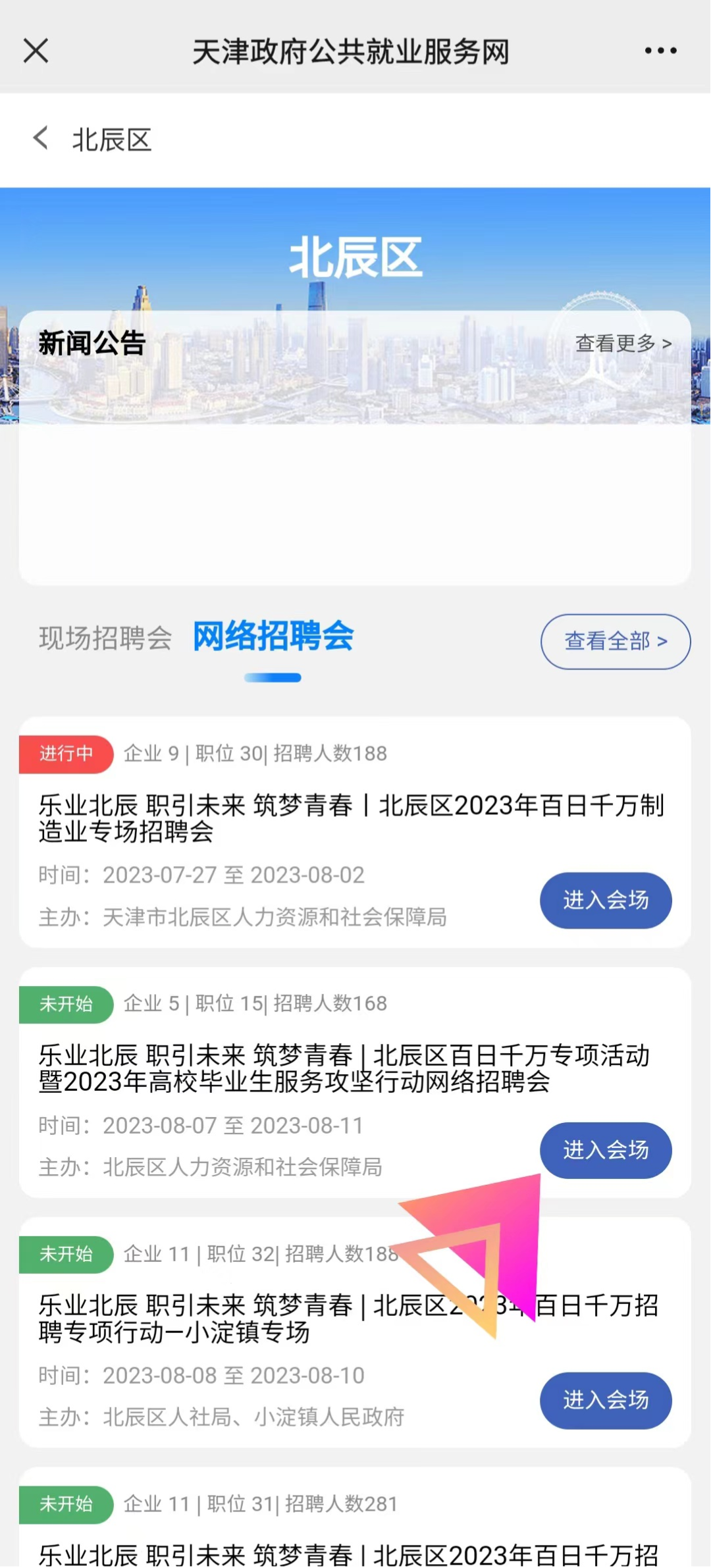 第四步:更多供需对接活动,如赴外省市招聘、校企撮合对接、进校宣讲等,参与方式:已注册天津政府公共就业服务网的北辰区企业,可电话联系招聘服务部:86912616申请加入“北辰区招聘群”,及时关注群消息,按要求报名活动。