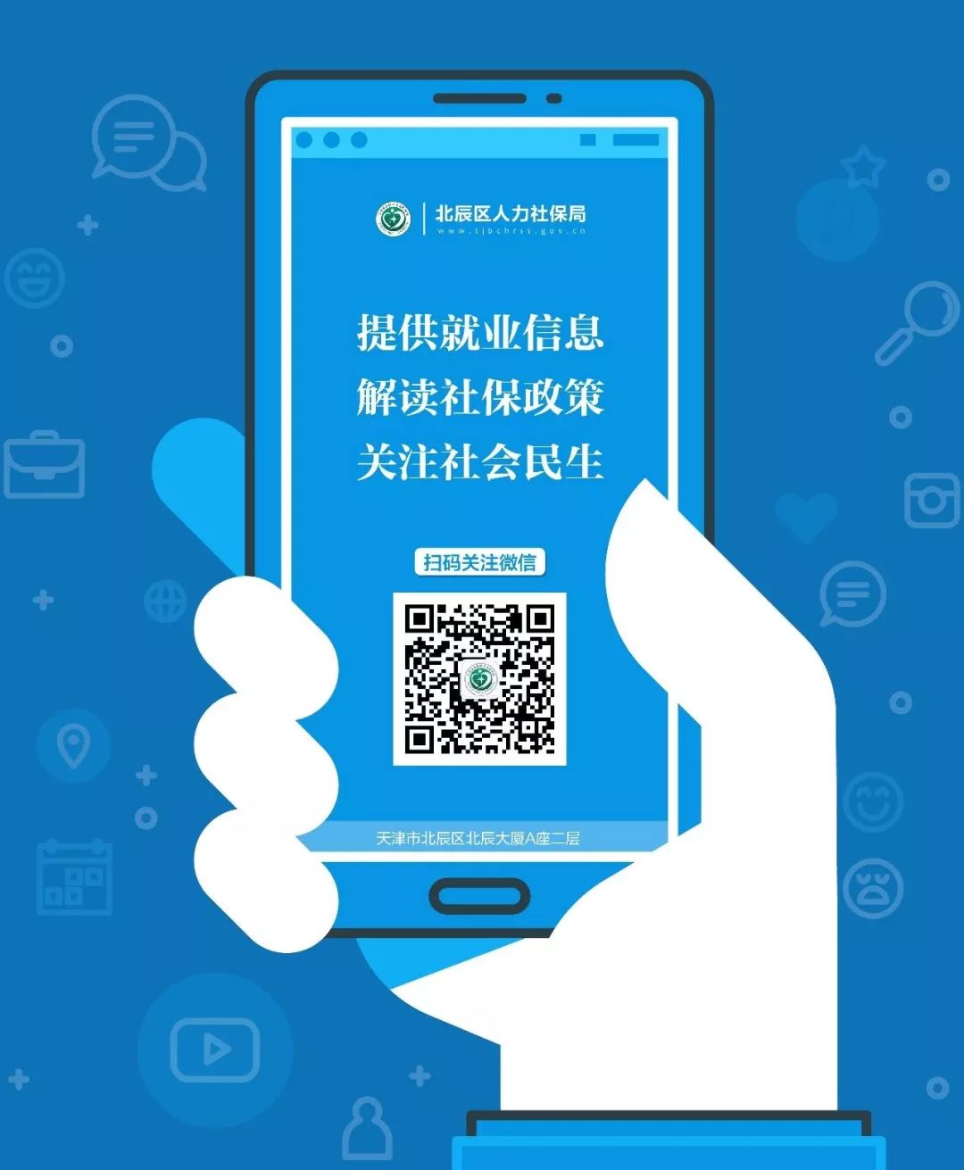 第一步:扫一扫下方二维码,关注“北辰区人力社保局”微信公众号,点击“求职招聘”菜单栏,选择“天津智慧招聘”,进入天津市政府公共就业服务网手机客户端。(PC端可以输入网址:http://zhzp.cnthr.com或网页搜索天津政府公共就业服务网进入本平台)