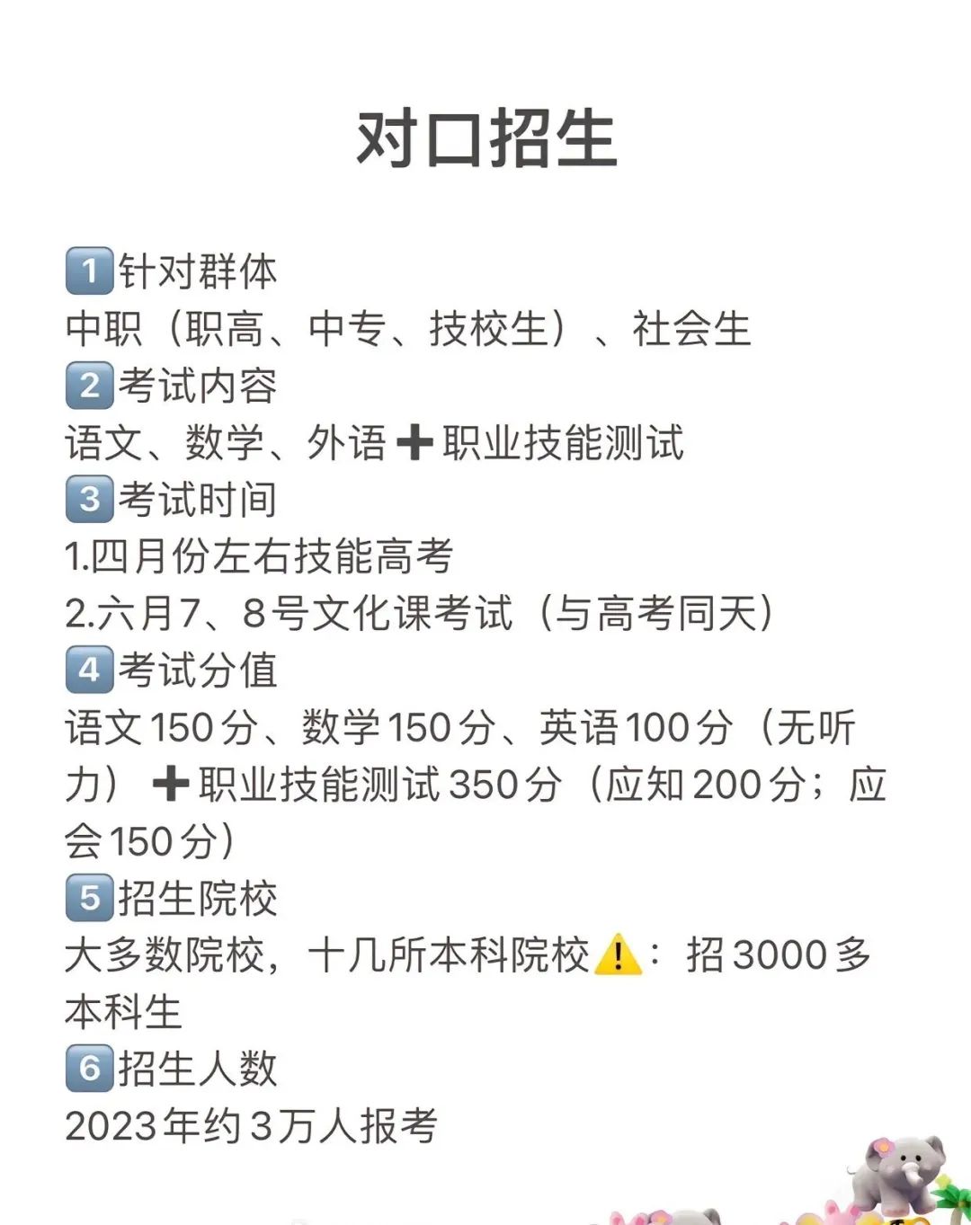 对口升学:招生对象主要是中等职业学校(包括普通中专、职业高中、职业中专、成人中专、技工学校)和综合高中职高班的应历届毕业生。