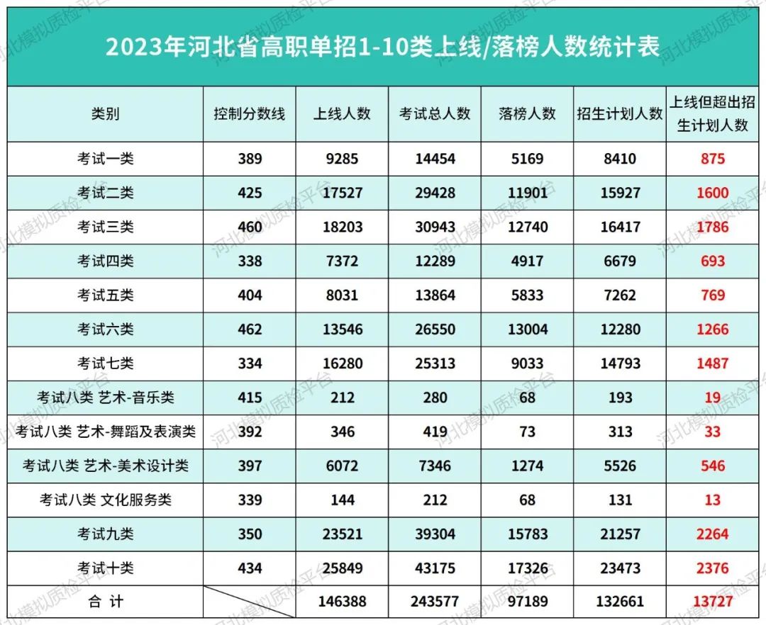 从图表的数据分析可以看出,上线但超出招生计划的人数,也就是标红的部分,1-10大类共有13727人。加上未过录取控制分数线落榜的97189人,一共有110916人面临无学可上的情况。所以说,在单招正式考试前,对于自己所处的位次有一个清醒的认知是十分有必要的。