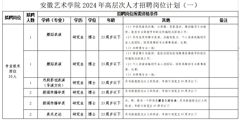 本次共计招聘20名专任教师,均纳入事业编制,招聘计划详见附件1《安徽艺术学院2024年高层次人才招聘计划表》