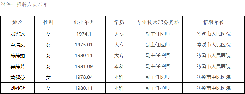 据《梧州市事业单位公开招聘人员实施细则》(梧政发〔2012〕52号)有关招聘的规定条件,具有副高级专业技术职务资格的邓兴冰等6名同志通过考核、体检合格,拟聘用为事业单位工作人员,现予以公示,公示期为2024年3月5日至3月11日。对所公示的同志拟聘用如有异议,请以书面形式,并署真实姓名和联系地址,于3月11日前邮寄或直接送市人力资源和社会保障局(直接送的以送达日期为准;邮寄的以邮戳为准)。邮政编码:543200,联系电话:0774-8222803,8235223。