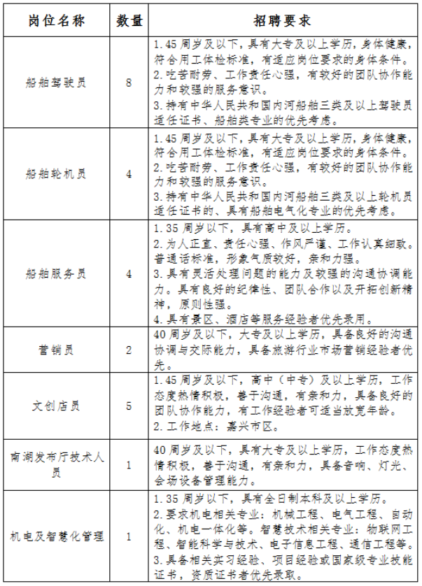 浙江南湖文化旅游集团有限公司是市直属大型国有独资企业嘉城集团全资子公司,主要负责国家5A级景区南湖旅游区、南湖湖滨二期等重大项目的运营管理和开发建设工作。因业务开展需要,现面向社会公开招聘工作人员,公告如下: