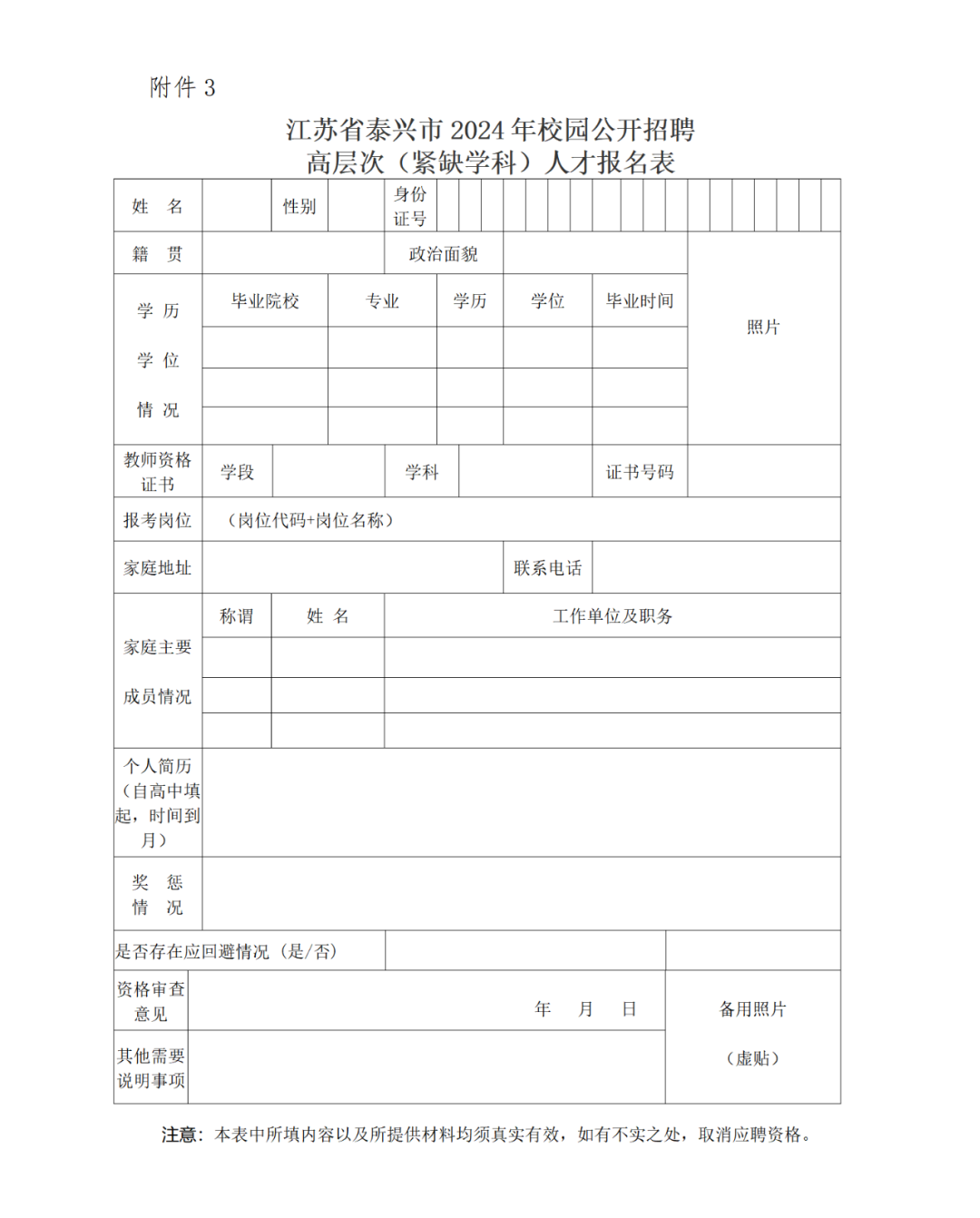 3.江苏省泰兴市2024年校园公开招聘高层次(紧缺学科)人才报名表