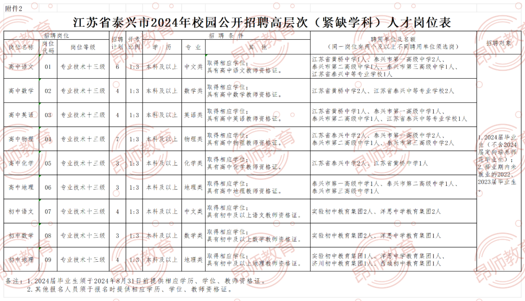 9.具备招聘岗位所要求的其他资格条件,具体招聘岗位、计划及相关要求等详见《江苏省泰兴市2024年校园公开招聘高层次(紧缺学科)人才岗位表》(附件2)。