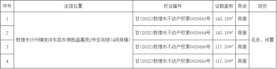 受委托,现将甘肃敦煌农村商业银行股份有限公司敦煌市沙州镇党河东路东侧凯盛嘉苑4间商铺转让项目面向社会公开推介,寻找投资人。