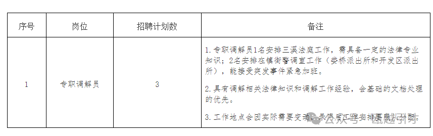 本次招聘专职调解员3名,具体岗位及工作职责要求详见《瓯海区司法局公开招聘编外人员计划表》(附件1)。