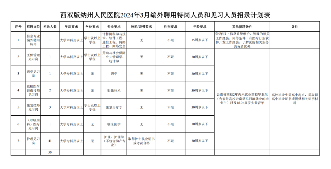 为加强西双版纳州州直卫生健康系统专业技术人才队伍建设,进一步做好人民群众医疗保障服务工作,根据《云南省人力资源和社会保障厅关于规范机关事业单位编外人员劳动用工管理的通知》(云人社通〔2022〕56号)、《西双版纳州人民政府办公室关于印发<西双版纳州州级机关事业单位编外聘用人员管理办法(试行)>的通知》(西政办发〔2017〕76号)以及《关于印发<云南省高校毕业生就业见习工作实施意见>的通知》(云人社发〔2009〕132号)《云南省人民政府办公厅关于进一步促进高校毕业生等青年就业创业若干措施的通知》(云政办发〔2022〕64号)及相关规定,西双版纳州人民医院计划开展2024年编外聘用特岗人员和见习人员招聘,现将招聘工作事项公告如下:
