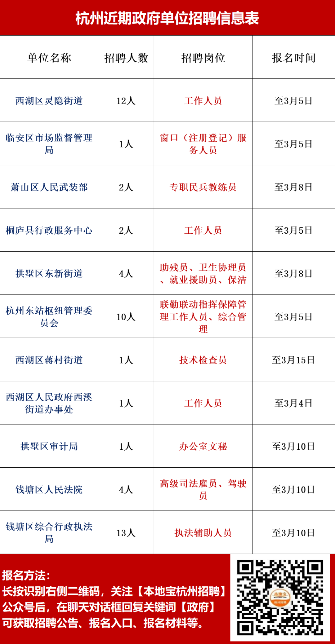 报名方式:关注本地宝杭州招聘微信公众号,首页对话框回复【审计】,即可查看拱墅区审计局报名方式及完整公告