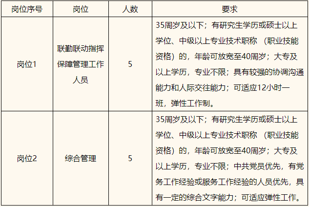 招聘10人,岗位有联勤联动指挥保障管理工作人员、综合管理,详见下表: