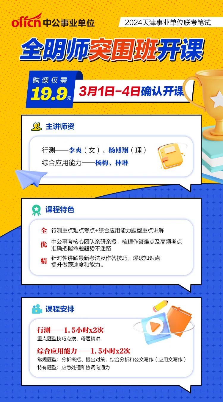 天津市特种设备监督检验技术研究院 招聘人数:8人 报名时间:3月11日9:00至20日16:00。 缴费时间:3月11日9:00至22日16:00。 笔试准考证下载时间:4月11日9:00至12日9:00 笔试时间:4月13日 笔试成绩公布时间:4月23日 笔试内容:《职业能力测试》和《专业能力测试》两科 点击卡片回复【0304】查看公告 联考突围班开课 掌握联考核心考点 今晚19点 行测理常考题型分析 点击图片听课