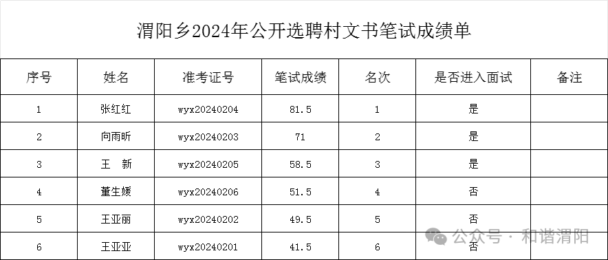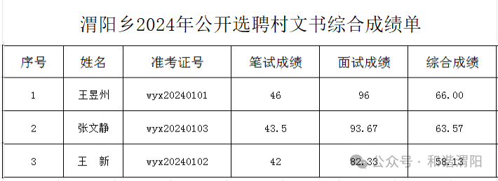 ![]() 渭阳乡公开选聘村文书笔试成绩公示 根据《陇西县渭阳乡选聘村文书的公告》,现将渭阳乡村文书笔试及面试结果予以公示。公示时间从2024年3月4日起至2024年3月8日止,公示期间如有异议,可向相关部门反映(联系电话:0932-6660686)。公示满无异议之后,经考察合格则及时录用上岗。 渭阳乡公开选聘渭阳村村文书笔试成绩公示 渭阳乡公开选聘村文书笔试已经结束,根据规定,现将笔试成绩予以公示,公示时间为2024年3月4日至2024年3月8日。