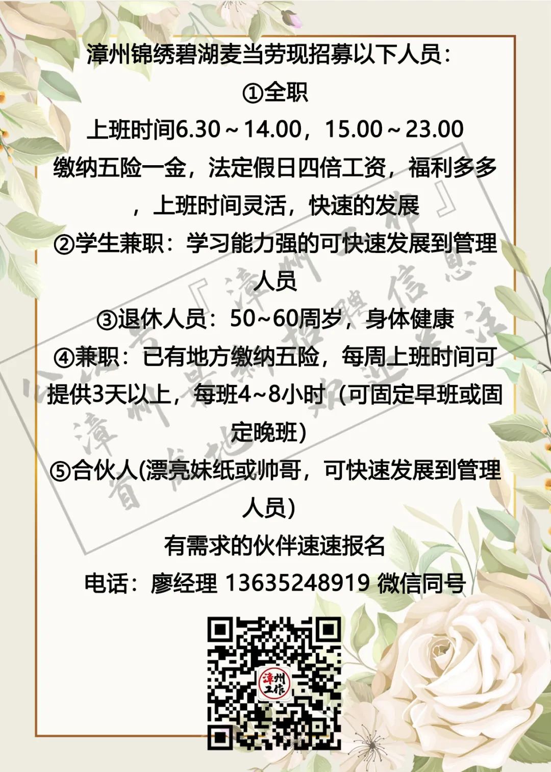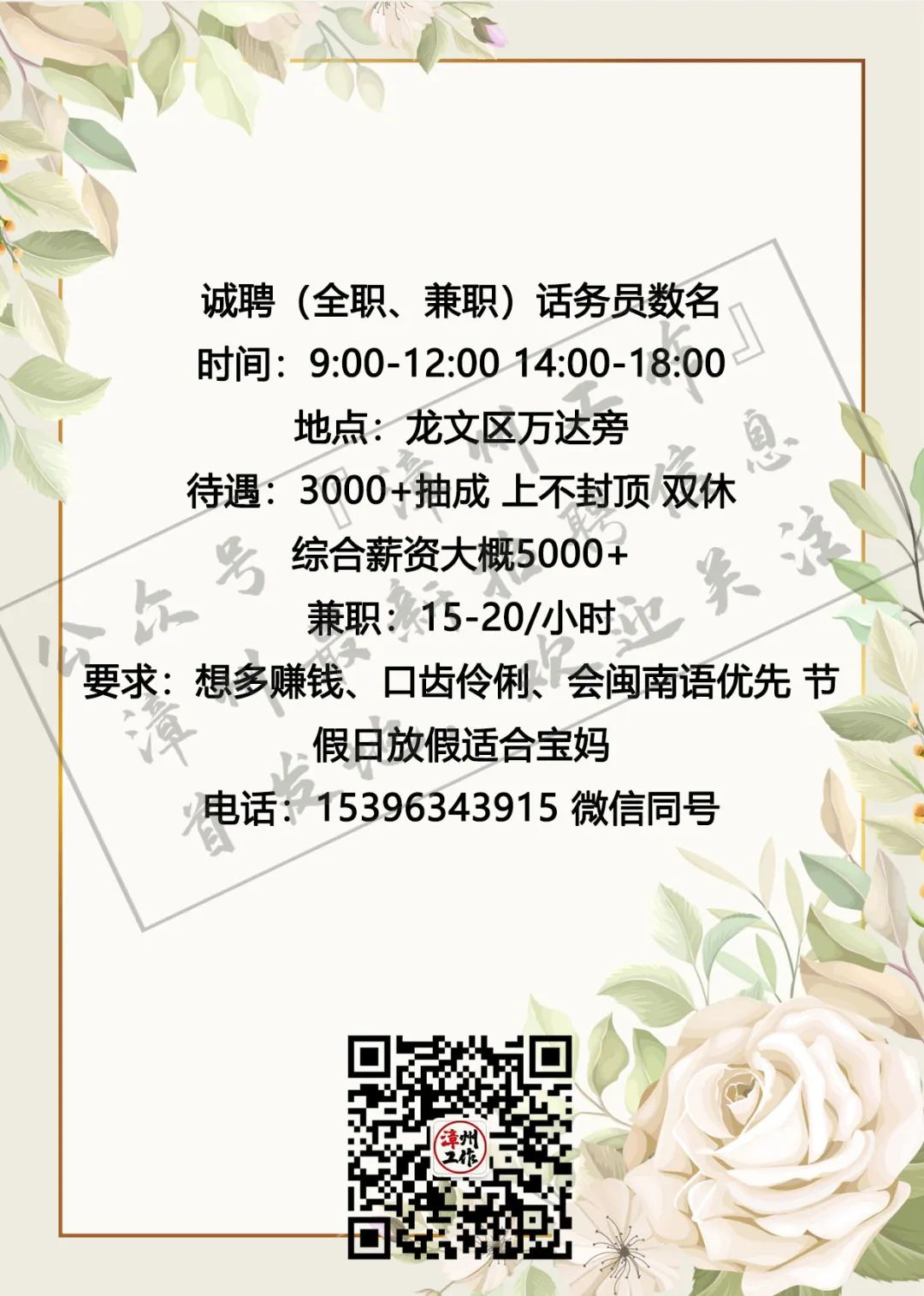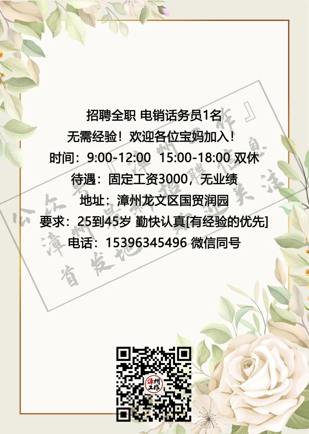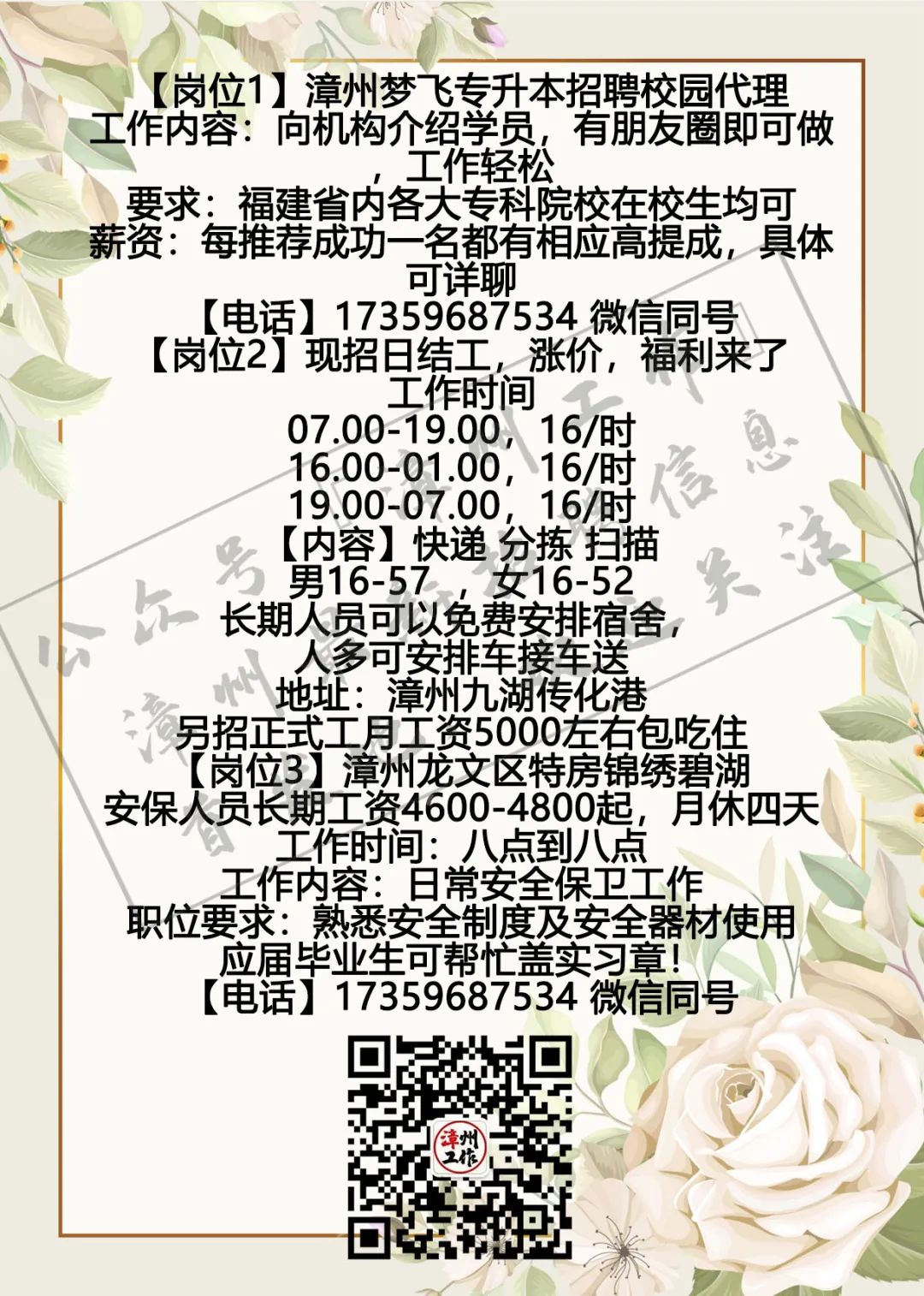3月4日漳州招聘信息 漳州招聘、全职合集 漳州兼职、全职大合集 茶山橖15159686275 电销话务员15396345496 辅导老师13799711816 柑仔鱼市18150243909 话务员15396343915 兼职老师18850227790 客服专员15375757589 麦当劳13635248919 茵菲乐13045968019 友酊13906950011 专升本17359687534 作业辅导13605084392 ***漳州工作提醒您:①任何招聘方以任何名义向应聘者收取任何费用都属于违法行为(如押金、培训费、体检费、资料打印费、物品使用费等等),望提高警惕并且注意个人安全; ②面试地点若是太过偏僻或者公司无牌照、毛坯房、装修怪异等,切勿轻易进入,太过偏僻的地方最好结伴同行; ③求职者切勿因为一时的利益放松警惕,轻信所谓“一部手机,每天至少XXX元”的虚假兼职信息; ④切勿轻信工资虚高且描述轻松的工作; ⑤留意公众号“漳州工作”以及微博“漳州兼职”发出的疑似虚假工作的提醒,加强自身的警惕心,一定不要因为求财心切而上当受骗,最后上当吃亏; ⑥本公众号所有发布工作均已经过核实以及筛选,大家可以放心咨询,如果碰到问题记得及时私信或者添加本人微信号进行反馈,本公众号定将大力支持打击虚假工作信息 (此内容均由漳州工作编辑整理,谢绝复制转发,若有侵权,定将追责!2019.5.19编辑) 想在漳州找工作?担心工作不靠谱?漫无目的找不到工作发布渠道?现在这些问题统统不是问题,关注漳州工作,【微博“漳州兼职”官方公众号】漳州最全、最快更新的兼职、全职信息发布招聘中心。 漳州求职找我们,漳州招聘找我们;漳州兼职、漳州全职,关注【漳州工作】就对啦!有需要合作的小伙伴可点击主页面中的“发布工作”添加工作君微信进行合作探讨与咨询。欢迎需要找工作、发布工作、了解漳州兼职、全职工作动态的小伙伴们联系工作君哦~ 对了对了,公众号不发布虚假、所谓网上兼职、不正规公司、微信解封、赌博类相关工作的信息哦!也希望找工作的小伙伴们关注信息的同时帮小编点个赞哟~每一次点赞都是对工作君工作的认可哟~谢谢大家啦!希望每个关注的小伙伴都能找到自己心目中的那份工作呀! 漳州招聘、求职合集 漳州兼职、全职大合集 划重点 为漳州的朋友提供兼职/全职工作 但兼/全职有风险各位请谨慎 |