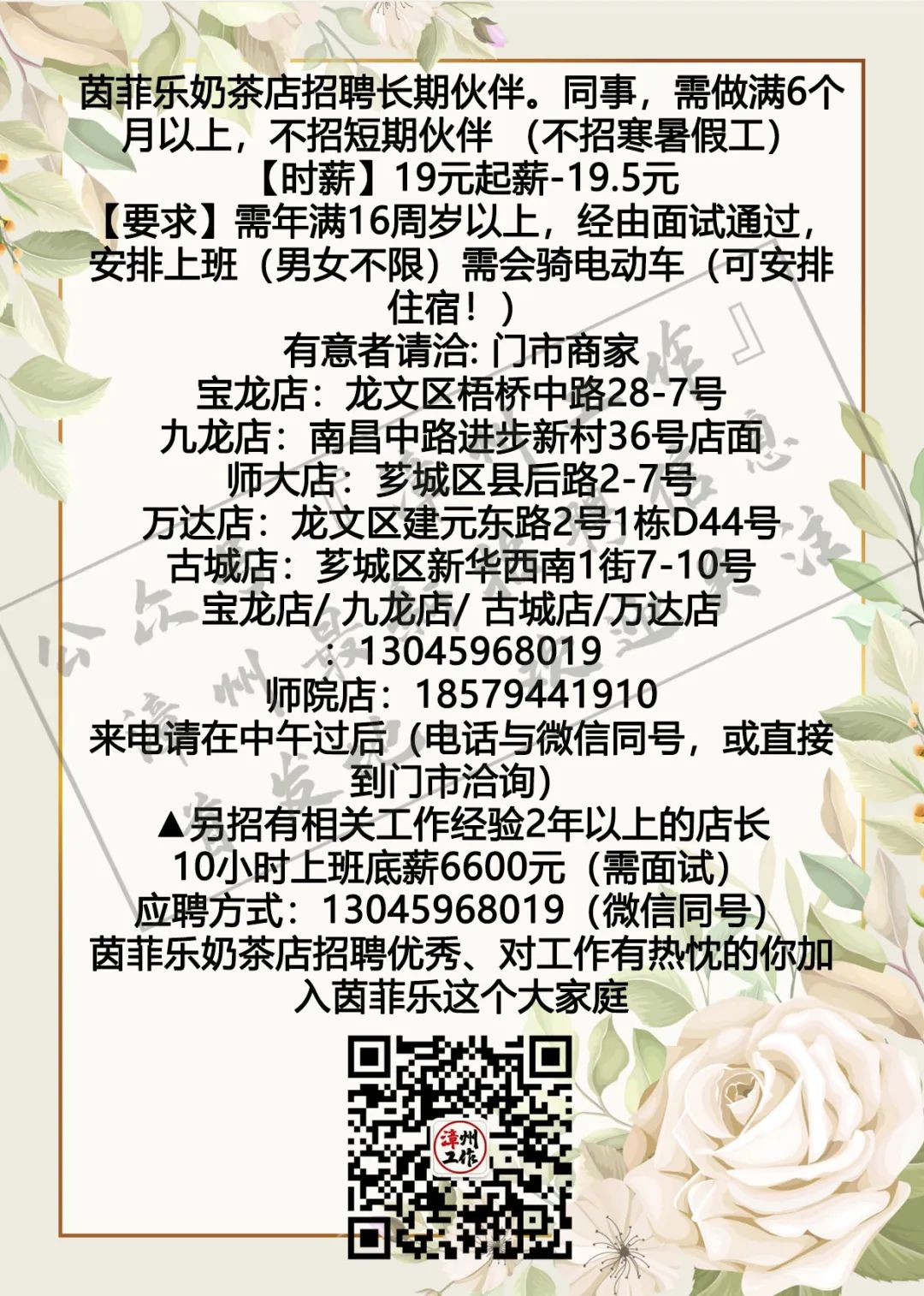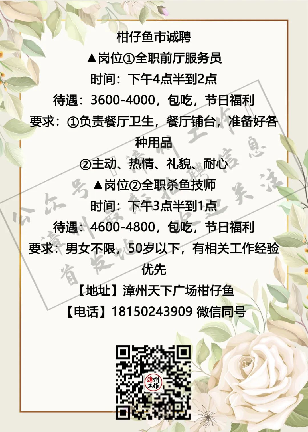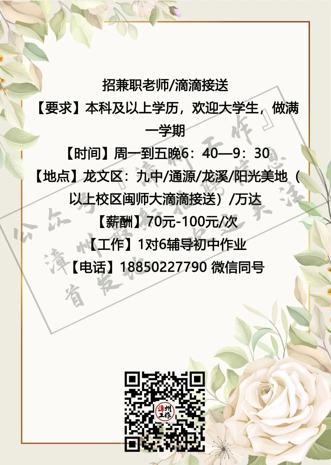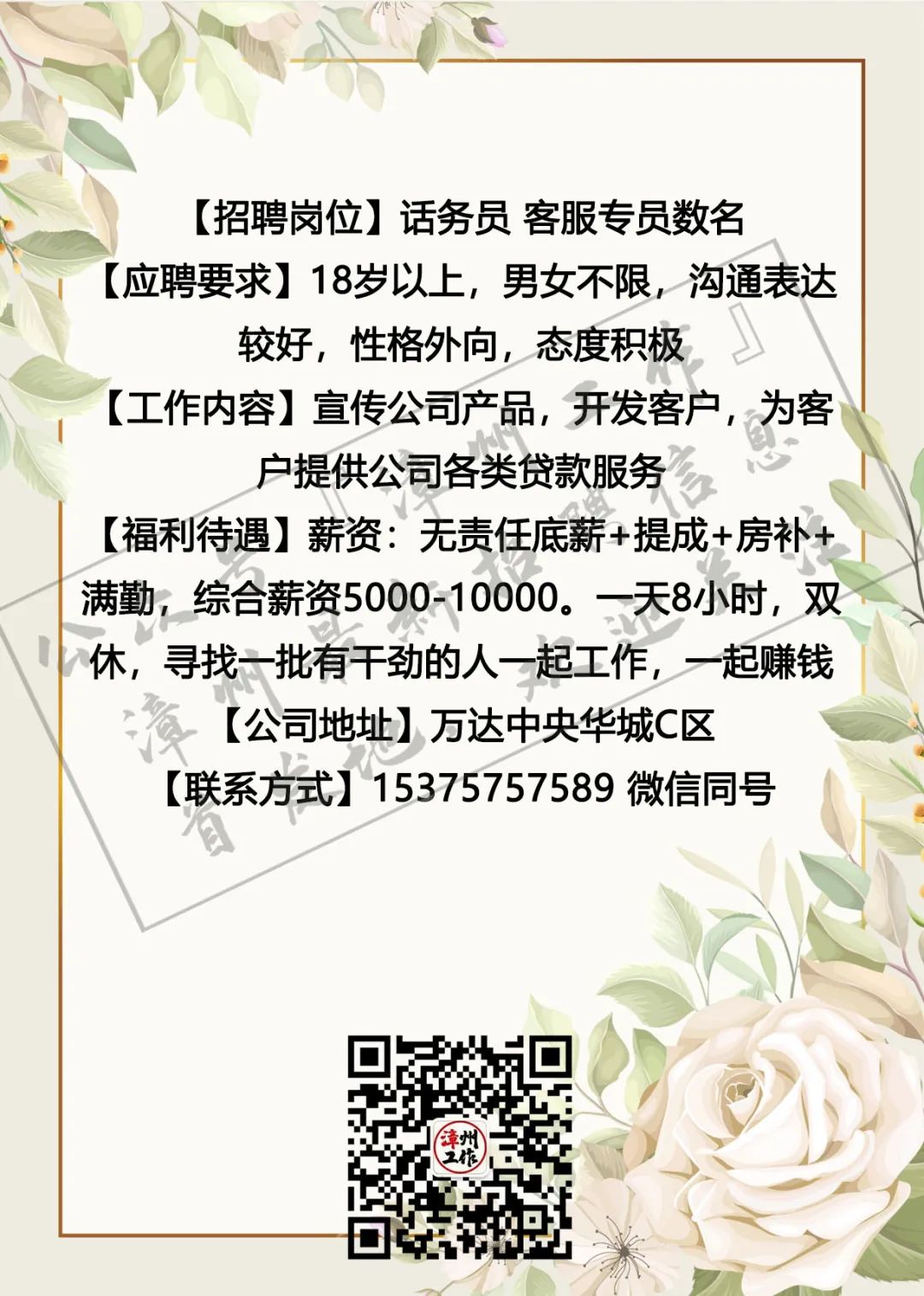 3月4日漳州招聘信息 漳州招聘、全职合集 漳州兼职、全职大合集 茶山橖15159686275 电销话务员15396345496 辅导老师13799711816 柑仔鱼市18150243909 话务员15396343915 兼职老师18850227790 客服专员15375757589 麦当劳13635248919 茵菲乐13045968019 友酊13906950011 专升本17359687534 作业辅导13605084392 ***漳州工作提醒您:①任何招聘方以任何名义向应聘者收取任何费用都属于违法行为(如押金、培训费、体检费、资料打印费、物品使用费等等),望提高警惕并且注意个人安全; ②面试地点若是太过偏僻或者公司无牌照、毛坯房、装修怪异等,切勿轻易进入,太过偏僻的地方最好结伴同行; ③求职者切勿因为一时的利益放松警惕,轻信所谓“一部手机,每天至少XXX元”的虚假兼职信息; ④切勿轻信工资虚高且描述轻松的工作; ⑤留意公众号“漳州工作”以及微博“漳州兼职”发出的疑似虚假工作的提醒,加强自身的警惕心,一定不要因为求财心切而上当受骗,最后上当吃亏; ⑥本公众号所有发布工作均已经过核实以及筛选,大家可以放心咨询,如果碰到问题记得及时私信或者添加本人微信号进行反馈,本公众号定将大力支持打击虚假工作信息 (此内容均由漳州工作编辑整理,谢绝复制转发,若有侵权,定将追责!2019.5.19编辑) 想在漳州找工作?担心工作不靠谱?漫无目的找不到工作发布渠道?现在这些问题统统不是问题,关注漳州工作,【微博“漳州兼职”官方公众号】漳州最全、最快更新的兼职、全职信息发布招聘中心。 漳州求职找我们,漳州招聘找我们;漳州兼职、漳州全职,关注【漳州工作】就对啦!有需要合作的小伙伴可点击主页面中的“发布工作”添加工作君微信进行合作探讨与咨询。欢迎需要找工作、发布工作、了解漳州兼职、全职工作动态的小伙伴们联系工作君哦~ 对了对了,公众号不发布虚假、所谓网上兼职、不正规公司、微信解封、赌博类相关工作的信息哦!也希望找工作的小伙伴们关注信息的同时帮小编点个赞哟~每一次点赞都是对工作君工作的认可哟~谢谢大家啦!希望每个关注的小伙伴都能找到自己心目中的那份工作呀! 漳州招聘、求职合集 漳州兼职、全职大合集 划重点 为漳州的朋友提供兼职/全职工作 但兼/全职有风险各位请谨慎 |