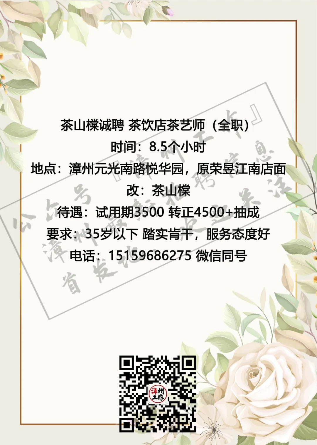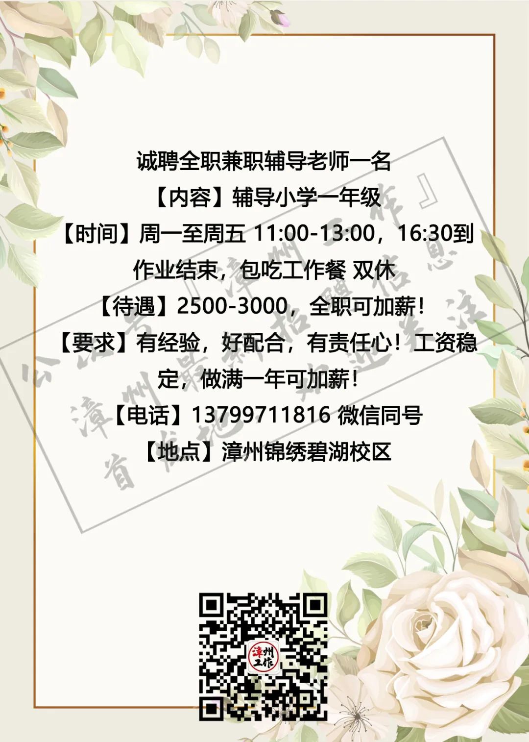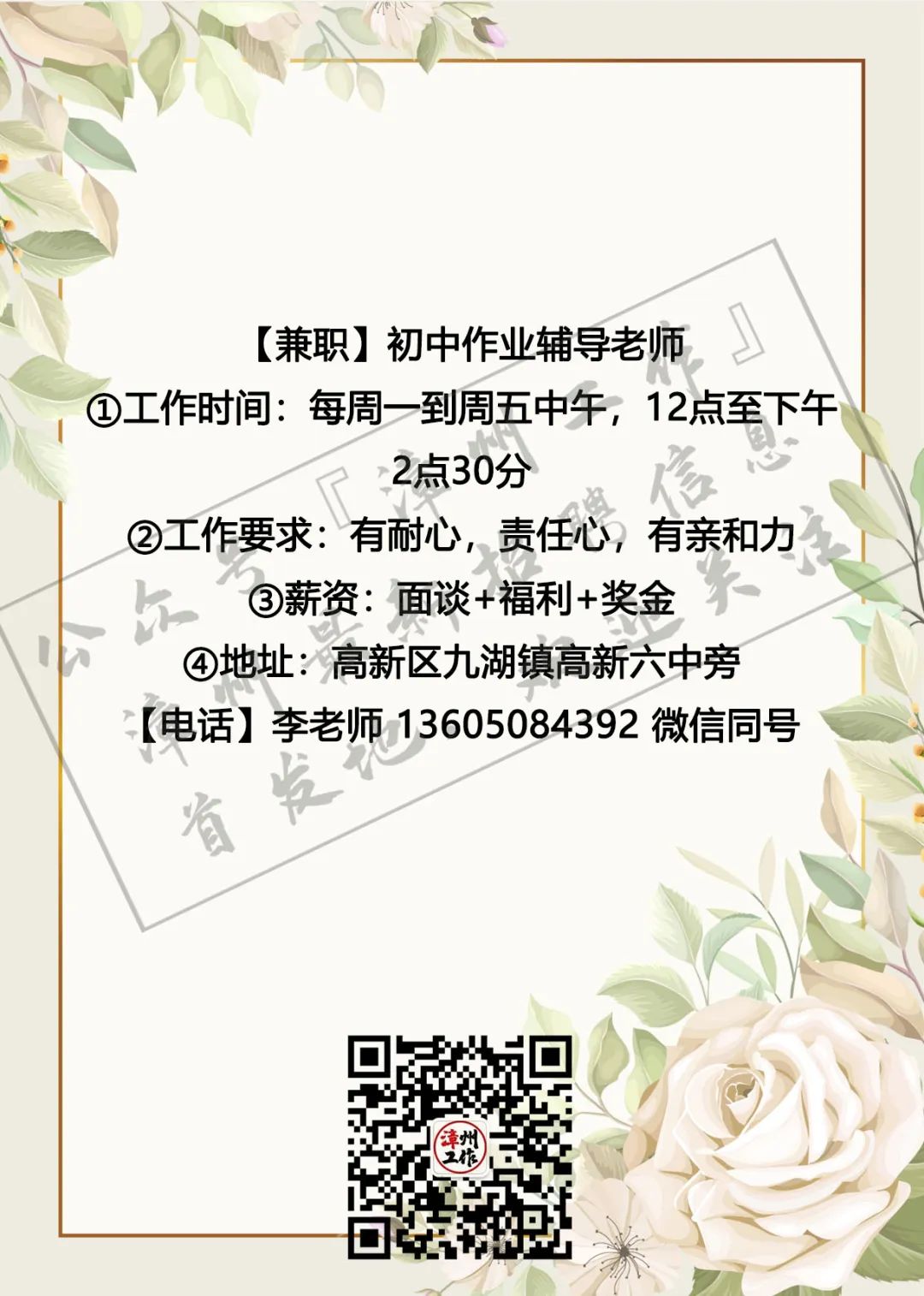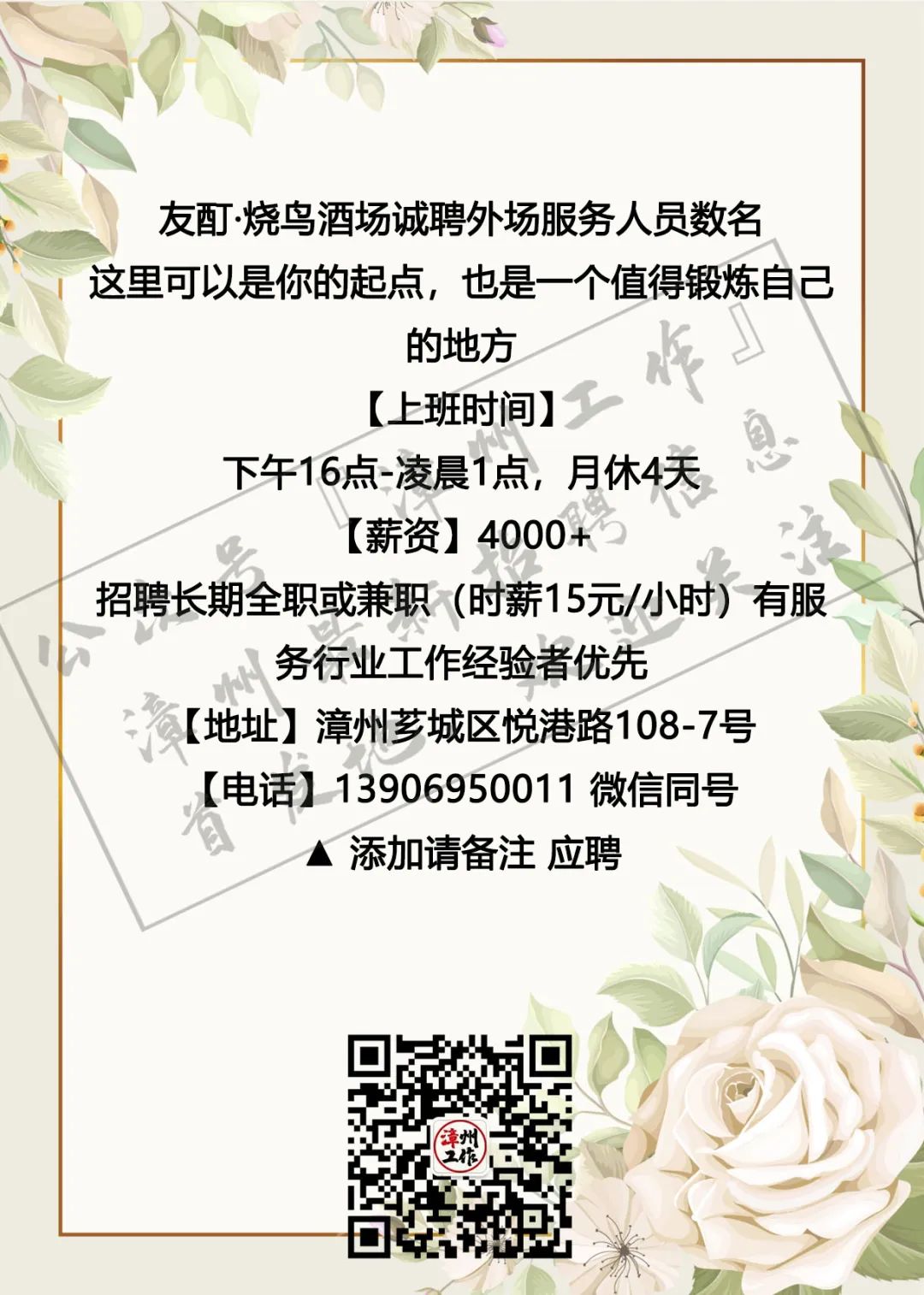 3月4日漳州招聘信息 漳州招聘、全职合集 漳州兼职、全职大合集 茶山橖15159686275 电销话务员15396345496 辅导老师13799711816 柑仔鱼市18150243909 话务员15396343915 兼职老师18850227790 客服专员15375757589 麦当劳13635248919 茵菲乐13045968019 友酊13906950011 专升本17359687534 作业辅导13605084392 ***漳州工作提醒您:①任何招聘方以任何名义向应聘者收取任何费用都属于违法行为(如押金、培训费、体检费、资料打印费、物品使用费等等),望提高警惕并且注意个人安全; ②面试地点若是太过偏僻或者公司无牌照、毛坯房、装修怪异等,切勿轻易进入,太过偏僻的地方最好结伴同行; ③求职者切勿因为一时的利益放松警惕,轻信所谓“一部手机,每天至少XXX元”的虚假兼职信息; ④切勿轻信工资虚高且描述轻松的工作; ⑤留意公众号“漳州工作”以及微博“漳州兼职”发出的疑似虚假工作的提醒,加强自身的警惕心,一定不要因为求财心切而上当受骗,最后上当吃亏; ⑥本公众号所有发布工作均已经过核实以及筛选,大家可以放心咨询,如果碰到问题记得及时私信或者添加本人微信号进行反馈,本公众号定将大力支持打击虚假工作信息 (此内容均由漳州工作编辑整理,谢绝复制转发,若有侵权,定将追责!2019.5.19编辑) 想在漳州找工作?担心工作不靠谱?漫无目的找不到工作发布渠道?现在这些问题统统不是问题,关注漳州工作,【微博“漳州兼职”官方公众号】漳州最全、最快更新的兼职、全职信息发布招聘中心。 漳州求职找我们,漳州招聘找我们;漳州兼职、漳州全职,关注【漳州工作】就对啦!有需要合作的小伙伴可点击主页面中的“发布工作”添加工作君微信进行合作探讨与咨询。欢迎需要找工作、发布工作、了解漳州兼职、全职工作动态的小伙伴们联系工作君哦~ 对了对了,公众号不发布虚假、所谓网上兼职、不正规公司、微信解封、赌博类相关工作的信息哦!也希望找工作的小伙伴们关注信息的同时帮小编点个赞哟~每一次点赞都是对工作君工作的认可哟~谢谢大家啦!希望每个关注的小伙伴都能找到自己心目中的那份工作呀! 漳州招聘、求职合集 漳州兼职、全职大合集 划重点 为漳州的朋友提供兼职/全职工作 但兼/全职有风险各位请谨慎 |