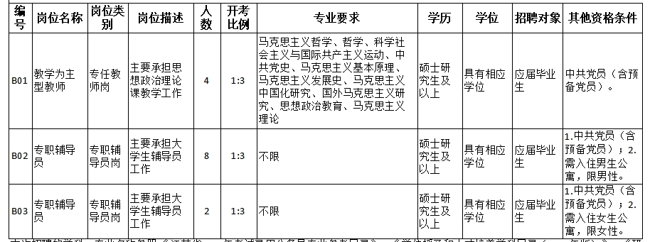 徐州工业职业技术学院是省教育厅主管的全额拨款事业单位,位于徐州市鼓楼区襄王南路1号。为更好地选拔优秀适岗人才,充实人才队伍,优化师资结构,徐州工业职业技术学院现面向社会公开招聘优秀人才。根据《江苏省事业单位公开招聘人员办法》等规定,现将有关事项公告如下: 一、报考条件 (一)具有中华人民共和国国籍,遵守中华人民共和国宪法和法律。 (二)遵纪守法,品行端正,团结协作,敬业乐群、廉洁奉公。 (三)适应岗位要求的身体条件。 (四)年龄要求为:不超过30周岁,即1994年1月1日之后出生。 (五)报考专职辅导员岗位,须为中共党员(含预备党员),并具备下列条件之一: 1.本科生或研究生阶段有主要学生干部工作经历1年及以上,担任过班长及以上职务,含班级(团支部)班长(书记),院系学生会(研究生会、团委)工作部门正职,校学生会(研究生会、团委)工作部门副职及以上,并提供能证明学生干部经历的学生干部聘书、聘任文件或院校出具的证明; 2.有1年及以上高校专职辅导员工作经历(指正式参加工作经历,不含个人学生时期实习、兼职工作经历); 3.有1年及以上企事业单位专职从事思想政治工作经历(指正式参加工作经历,不含个人学生时期实习、兼职工作经历)。专职从事思想政治工作是指在党的基层委员会、总支部委员会、支部委员会担任专职书记、副书记,或在纪检和党办、组织(人事)、宣传、统战等党的工作部门中专职从事思想政治工作,或在工会、共青团、妇联专职从事思想政治工作,以及专职从事思想教育或职业道德建设工作。 (六)具备报考岗位要求的专业、技能等资格条件(详见岗位表)。本次招聘的应届毕业生须于2024年8月31日前毕业并取得学历学位证书,且仍无工作单位。2022年和2023年普通高校毕业生,若仍未落实工作单位,其档案关系仍保留在原毕业学校,或保留在各级毕业生就业主管部门(毕业生就业指导服务中心)、人才交流服务机构和公共就业服务机构的,以及国(境)外同期毕业且已完成学历认证但仍未落实工作单位的人员,可应聘应届毕业生岗位。 国(境)外教学科研机构学习同期毕业人员,指在国(境)外教学科研机构学习,与国内应届毕业生同期毕业的留学人员,同期毕业的时间要求与国内应届毕业生一致。 计算学生干部任职经历、工作经历的基准日期为招聘公告发布之日。 (七)取得祖国大陆普通高校学历的台湾学生和取得祖国大陆承认学历的其他台湾居民应聘时按国家和我省有关规定执行。 二、报名 (一)报名时间、地点、方式 应聘人员通过“江苏省属事业单位公开招聘平台”报名,照片上传、资格初审和缴费确认,均通过网络同步进行。报名网址:https://rs.jshrss.jiangsu.gov.cn/index/f/RCRS_0056(江苏省人力资源和社会保障厅网上办事服务大厅) 1.报名、照片上传:3月11日9∶00-3月25日16∶00; 2.资格初审:3月11日9∶00-3月26日16∶00; 3.陈述申辩:3月11日-3月27日期间9∶00-16∶00; 4.对初审异议的处理:3月11日9∶00-3月27日18∶00; 5.缴费确认:3月11日9∶00-3月28日12∶00。 (二)网上确认 1.应聘人员网上提交报名信息24小时后(节假日顺延)可到报名网站查询是否通过招聘部门(单位)资格初审。 2.本次公开招聘收取报名费100元,通过初审后的应聘人员进行网上支付,在网上缴纳报名费100元。通过初审并且完成缴费确认的人员,即报名成功。 3.未按时在网上确认报名资格、上传照片、要求缴纳报名费而未缴的视为报名无效。 (三)网上打印准考证 通过资格初审和缴费确认的应聘人员,请到江苏省人力资源和社会保障厅网上办事服务大厅下载、打印准考证。打印准考证开始时间将在徐州工业职业技术学院人事处网站(http://rs.xzcit.cn/)公布,结束时间为考试当天开考前。打印中如有问题,请拨打电话:025-52616712。 (四)报名注意事项 1.应聘人员按岗位要求和网上提示,如实填写有关信息,并上传本人近期免冠正面二寸(35X45毫米)证件照,jpg格式,大小为20Kb以下。 应聘人员在报名时请对照报考条件,在“考生简历(含学校经历从高中填起)”栏写明高中之后至今的学习及工作经历(岗位有其他资格条件要求的请填写完整),时间具体到月。报考专职辅导员岗位的,须明确写明符合“一、报考条件、第(五)条”中的第几点,其中以符合“担任主要学生干部1年及以上”条件报名的需写明担任职务名称和起止年月,符合其他条件的要写明符合担任职务(或工作经历)和起止年月。未填写的视作无相关经历。因信息填写不准确、不完整而导致的问题责任自负。 招聘部门(单位)根据应聘人员提供的信息进行审核。应聘人员弄虚作假的,一经查实,即取消应聘资格。 2.本次招聘岗位为短期招聘岗位,开考比例为1︰3,如未达到开考比例,将核减或取消该招聘岗位,并在省人力资源社会保障网上公告。应聘被取消岗位的人员可在2024年3月29日9:00-16:00登录到江苏省属事业单位公开招聘平台补报其他符合条件的岗位。 3.应聘人员只能从岗位表选择一个岗位报名。资格初审通过后,不可更改报名信息。未通过资格初审的应聘人员,在报名期内,可以改报符合资格条件的其他岗位。应聘人员要使用在有效期内的第二代居民身份证进行报名,报名与考场使用的身份证必须一致。 4.有下列情形之一的,请勿报名应聘: ①现役军人、普通高校在读非应届毕业生; ②与事业单位负责人员有夫妻关系、直系血