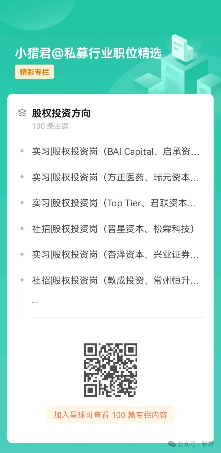 招聘单位:喜马拉雅 招聘职位:战略管理部-战略分析实习生 工作地点:上海 工作职责: 1、分析互联网泛文娱/亲子市场/银发市场未来趋势,追踪行业前沿动态; 2、协助进行细分行业和公司深度调研,公司访谈,完成行业研究、会议纪要等工作; 3、国内外互联网平台业务战略/策略研究,支持公司相关业务的策略设计; 4、本科150元/天;研究生180元/天,另有额外餐补等。 任职要求: 1、海内外一流大学本/硕优先; 2、自驱力强,excel、ppt等基本功扎实; 3、熟悉行业前沿趋势,对互联网行业和大亲子方向有深度思考;有互联网战略、咨询、PEVC等相关实习经历优先; 4、线下全勤优先,3个月及以上; 5、偏好非应届生,互联网战略+咨询背景优先,能保证时间者优先。 附带过往咨询商赛/行研作品等为加分项。 投递须知: 投递邮箱:invest-intern@ximalaya.com 邮件主题及履历命名:应聘"职位"+姓名+猎君公众号 加入求职VIP社群获取更多职位:XiaoLieJunTJ(微信) 招聘单位:善达投资 公司累计管理母基金和直投基金共计80余支,管理规模近400亿元,重点覆盖新能源、新材料、先进装备制造、新一代信息技术、生物医药等战略新兴领域,通过母基金和直投基金直接或间接投资300+项目,其中90+项目实现完全或部分退出,30+企业IPO上市、10+企业被上市公司收购实现间接上市、10+企业已报会在排队或即将报会。官网网址:http://www.shandacapital.com.cn 招聘职位:投资团队实习生 工作地点:上海市杨浦区,4/12号线大连路地铁站,18号线江浦公园站。 工作时间:大三以上或研究生在读学生,一周能 onsite3 天及以上,至少可以实习 3 个月 薪资待遇:硕士180RMB/天 工作职责: 1、协助投资总监做行业分析、项目分析、初步尽调等; 2、撰写投资立项报告、尽职调查报告等; 3、其他投资部门需要协助事宜。 任职要求: 1,商科/理工科相关专业,对新能源、半导体、电子信息、大数据等相关行业熟悉; 2,擅长投资分析测算,学习能力强,文字功底强,踏实勤奋,有较强的行业敏感度。 投递方式:发送①简历②研究报告成果(如有)至邮箱。 投递须知: 投递邮箱:hr@shandacapital.com.cn 邮件主题及履历命名:应聘"职位"+姓名+猎君公众号 加入求职VIP社群获取更多职位:XiaoLieJunTJ(微信) |